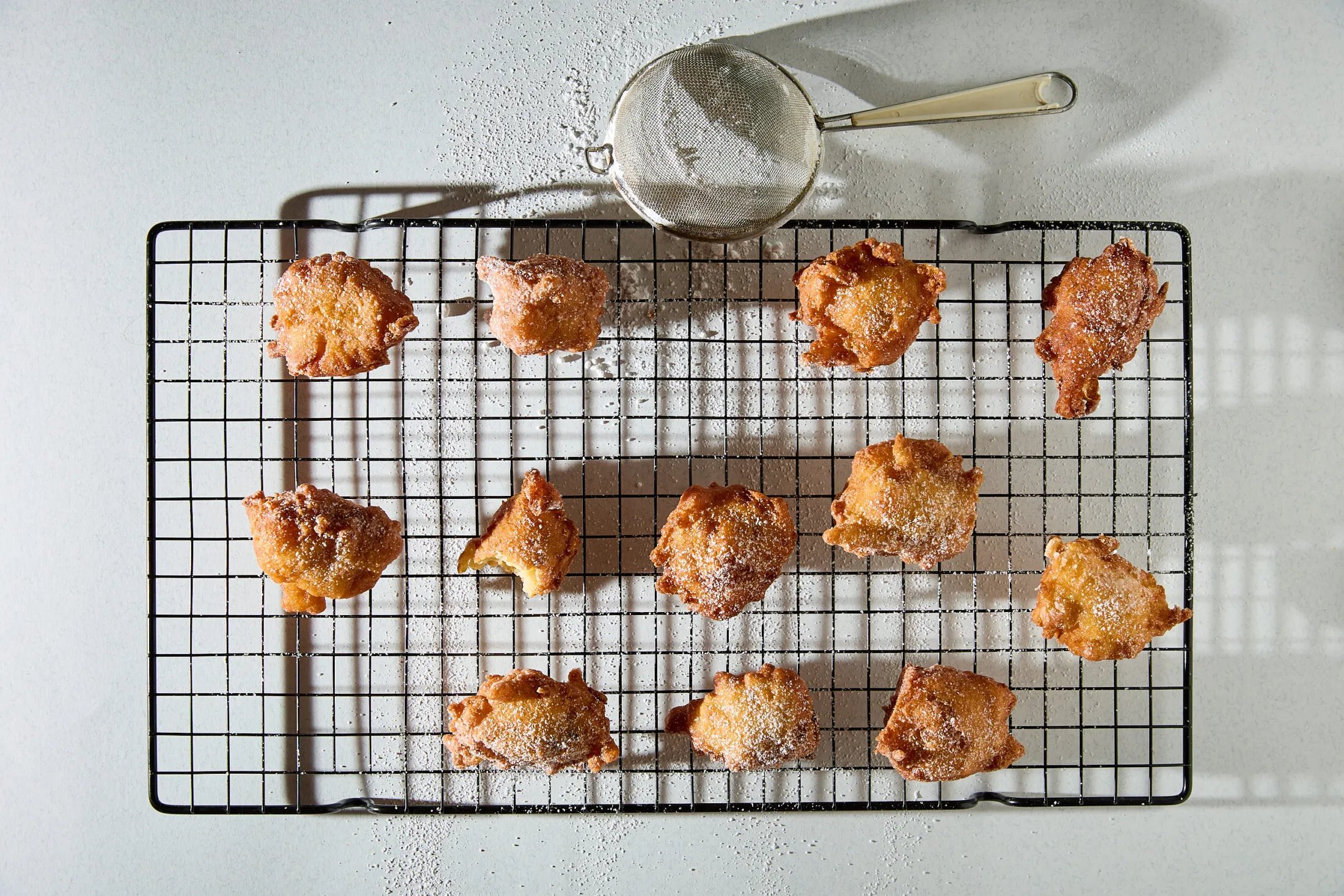 Bő, kb. 160 fokra melegített olajba evőkanálnyi mennyiségeket szaggatunk a tésztából, és 2-3 adagban kisütjük a fánkokat. Porcukorral megszórva, vagy egy kis baracklekvárral  tálaljuk.