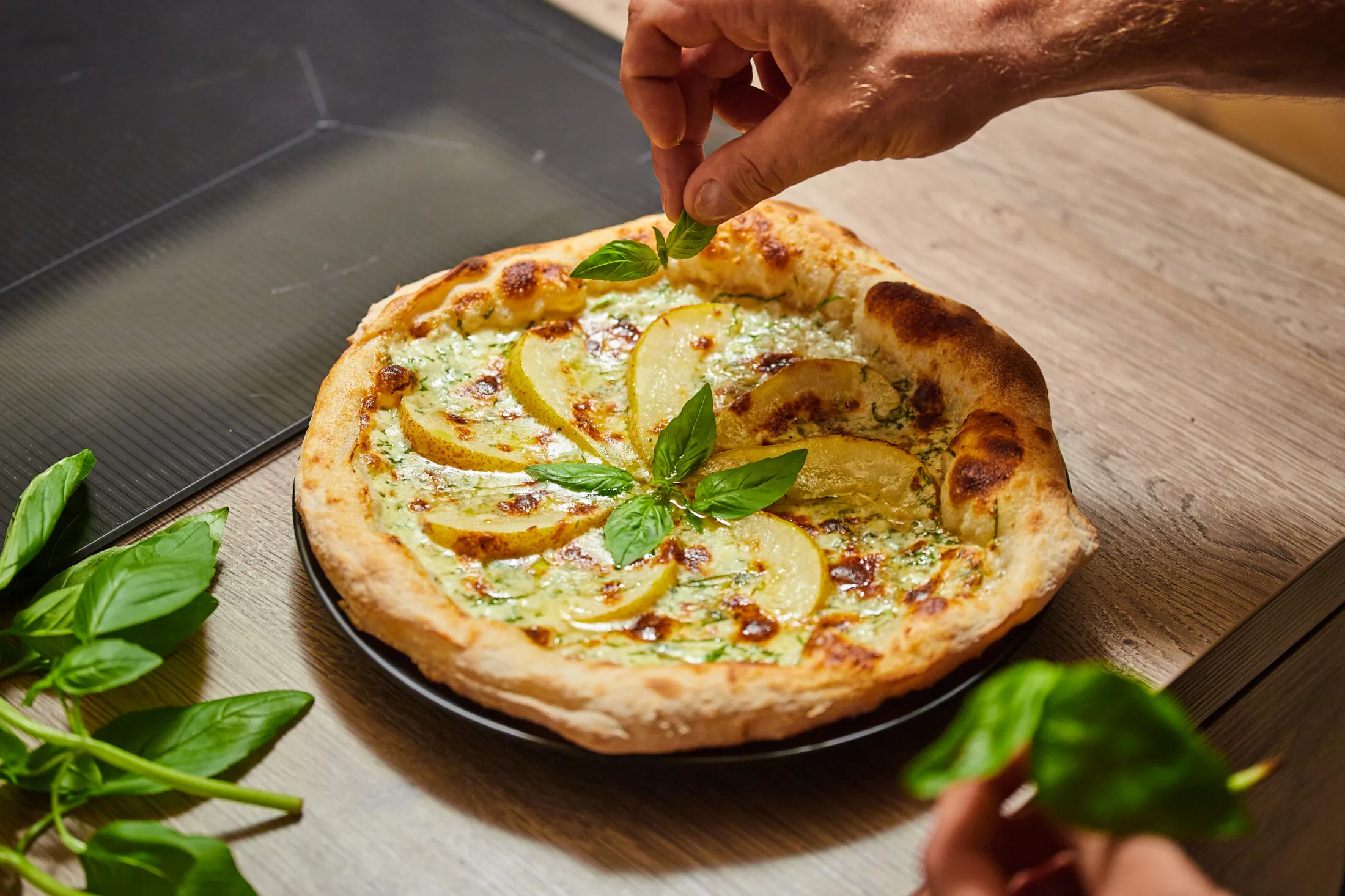 A tésztát egy spakli segítségével kiemeljük a dobozból és belerakjuk a réteslisztbe. A kezünkkel kerek formára igazítjuk a bucit, majd az ujjainkat összeszorítva elkezdjük a közepétől a széle felé kilapítani a tésztát úgy, hogy közben egy peremet is képezzünk. Majd a kézfejünkre emelve a megfelelő méretűre nyújtjuk a tésztát. (Ez attól is függ, hogy mekkora a sütőterünk.)