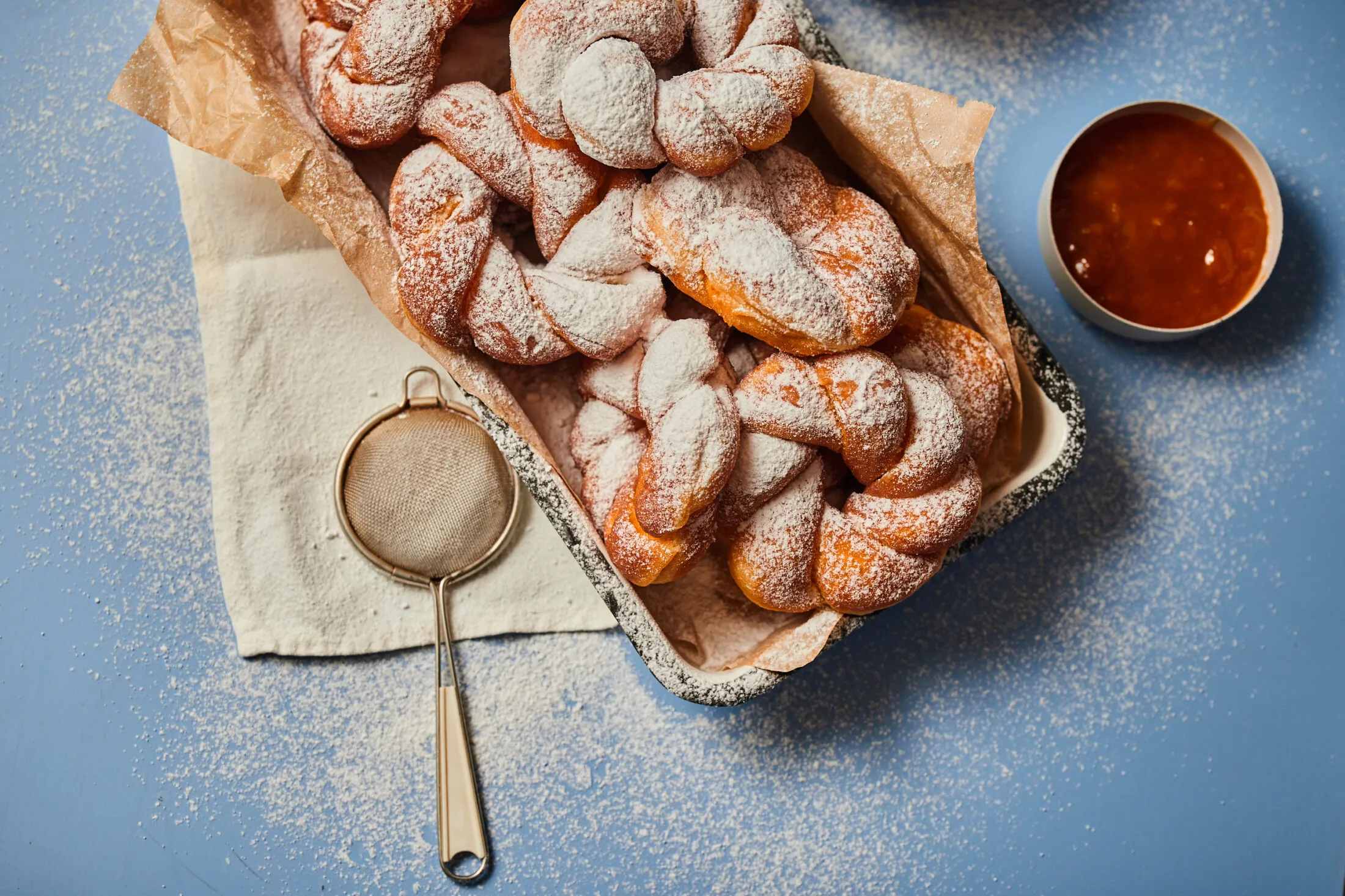 Miután megkelt a tészta, enyhén lisztezett felületre borítjuk, kissé átgyúrjuk és kb. 50 g-os kis tésztadarabokat vágunk le belőle, amikből kb. 30 cm-es kis hurkákat sodrunk. Ezeknek a végeit keresztezzük úgy, hogy fölül egy kört kapjunk, a maradék tészta pedig lelógjon a kör aljából. Ezeket a lelógó tésztadarabokat szorosan a kör köré hurkoljuk úgy, hogy egy mutatós kis koszorút kapjunk. A tészták végeit összenyomkodjuk. Egy konyharuhával letakarjuk és 15-20 percet hagyjuk kelni.