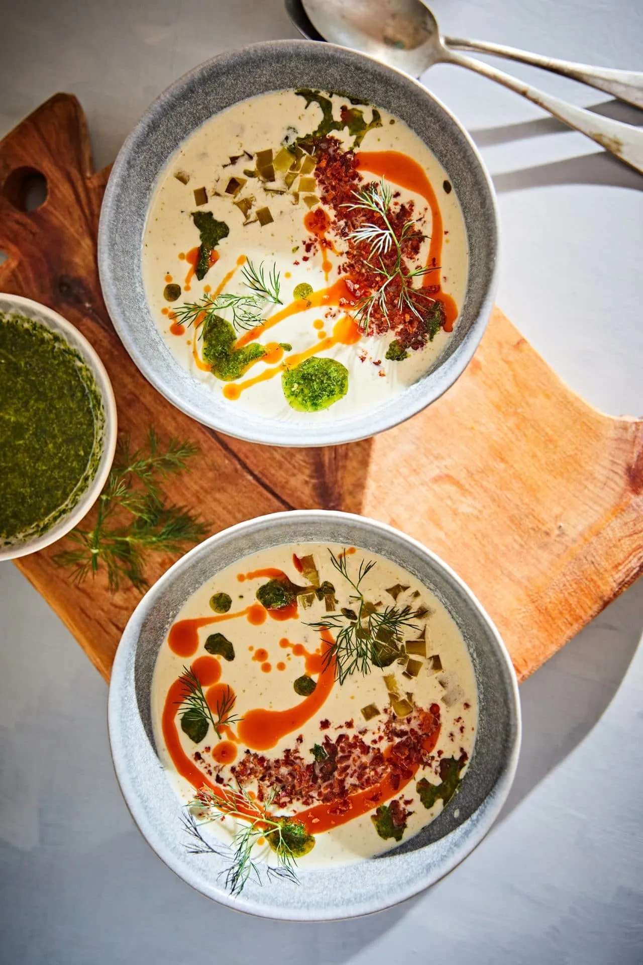 A betéthez való kovászos uborkát apró kockákra vágjuk. A levest jéghidegen tálaljuk, megszórjuk a kolbászmorzsával és az uborkakockákkal, meglocsoljuk a salsa verdével és a kolbász zsírjával, majd egy pár levél kaprot teszünk rá.