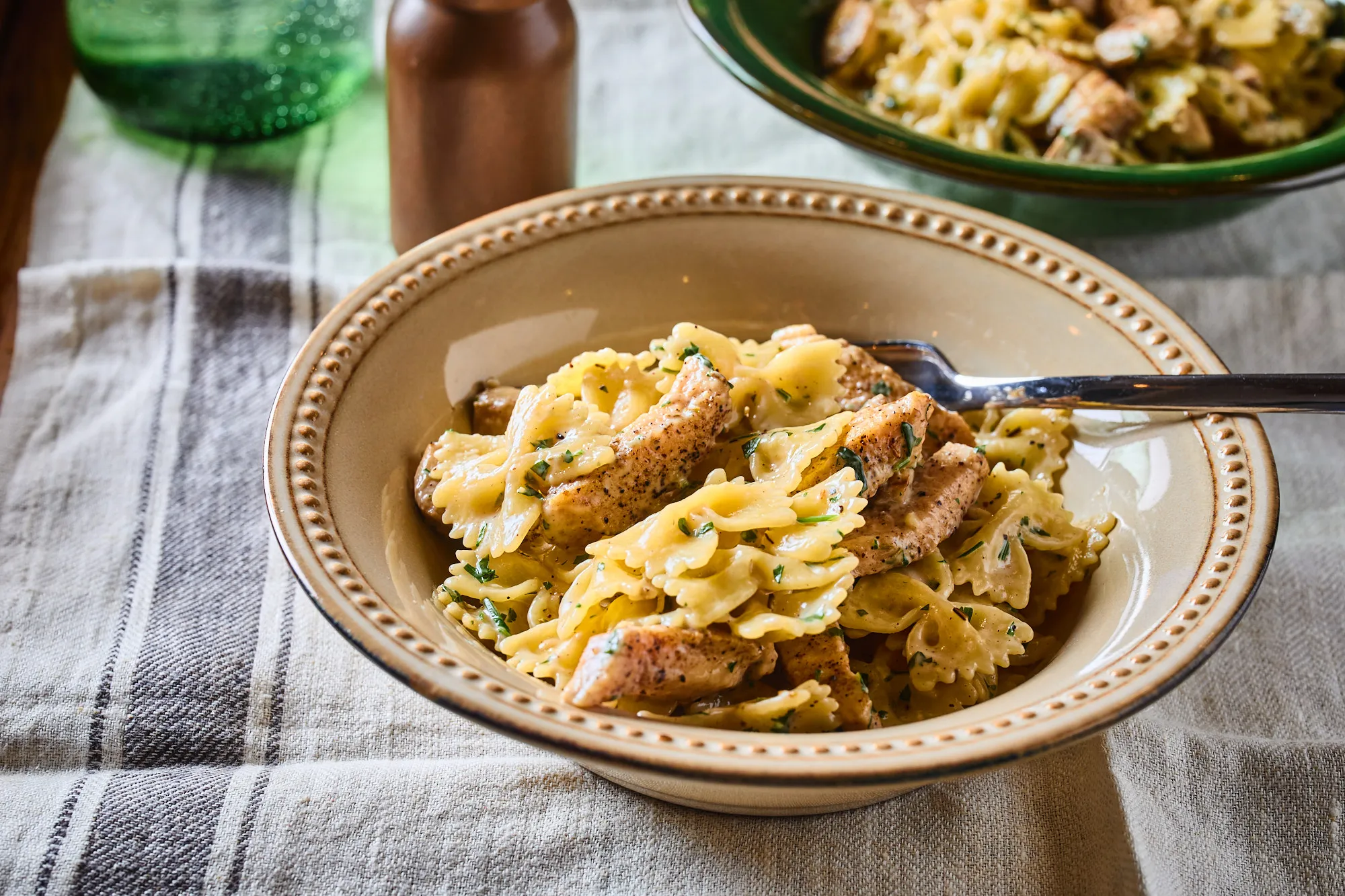A gombákat félbe vagy negyedbe vágjuk és egy száraz, tűzforró serpenyőben só nélkül jól lepirítjuk, félretesszük. A tésztát sós, forró vízben főzni kezdjük. Közben pedig a serpenyőbe nyomunk 2 ek étolajat és a falatkákra vágott csirkemellet sóval, borssal, rozmaringgal és szerecsendióval jól átpirítjuk. Hozzáadjuk a zúzott fokhagymát és a gombát, átforgatjuk és egy perc múlva belenyomjuk a krémsajtot. Összeforgatjuk az egészet, majd rászórjuk a finomra vágott petrezselymet, végül az időközben pont al dentére készült tésztát leszűrjük és 4-5 evőkanálnyi főzővízzel a krémsajtos-gombás alapra dobjuk. Összeforgatjuk és kéééész a krémsajtos tészta csirkével.