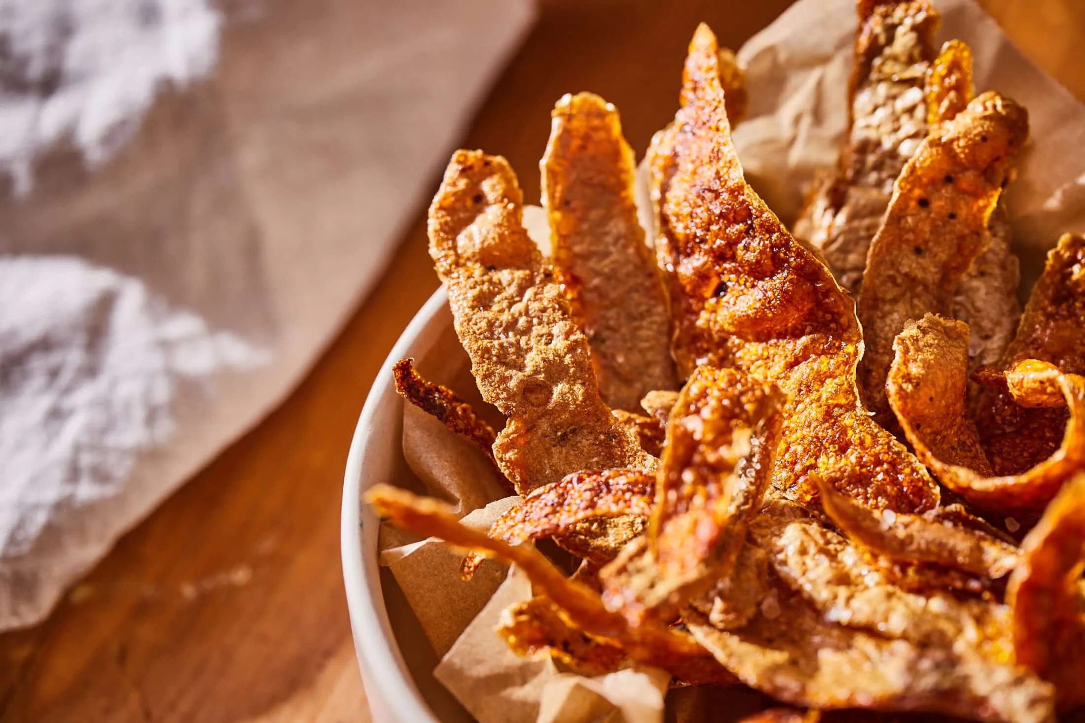 A krumplihéjchips elkészítéséhez először a krumplikat alaposan megmossuk, megpucoljuk, és a héját legalább 2 órára vízbe áztatjuk, majd egy konyharuha és konyhai papírtörlő segítségével alaposan szárazra töröljük.