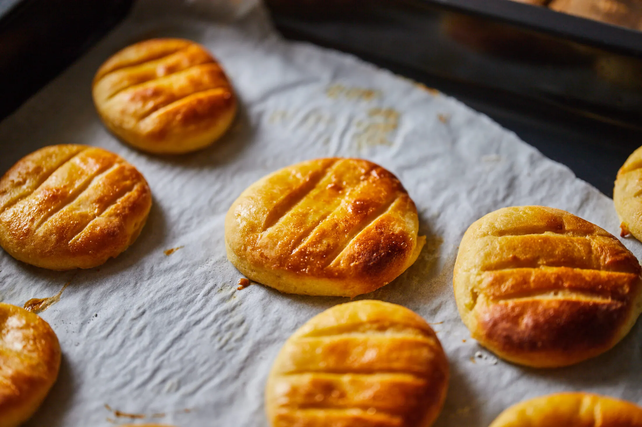 A megkelt tésztát lisztezett felületen 1-1,5 cm vastagra nyújtjuk, és 4-5 cm átmérőjű „pogácsákat” szaggatunk belőle. Pár helyen 1-2 mm mélyen bevagdossuk a tetejüket, újra letakarjuk és kb. 15 percig kelesztjük. Majd lekenjük a tetejüket felvert tojással, és 180 fokra előmelegített sütőben kb. 25 perc alatt aranybarnára sütjük.