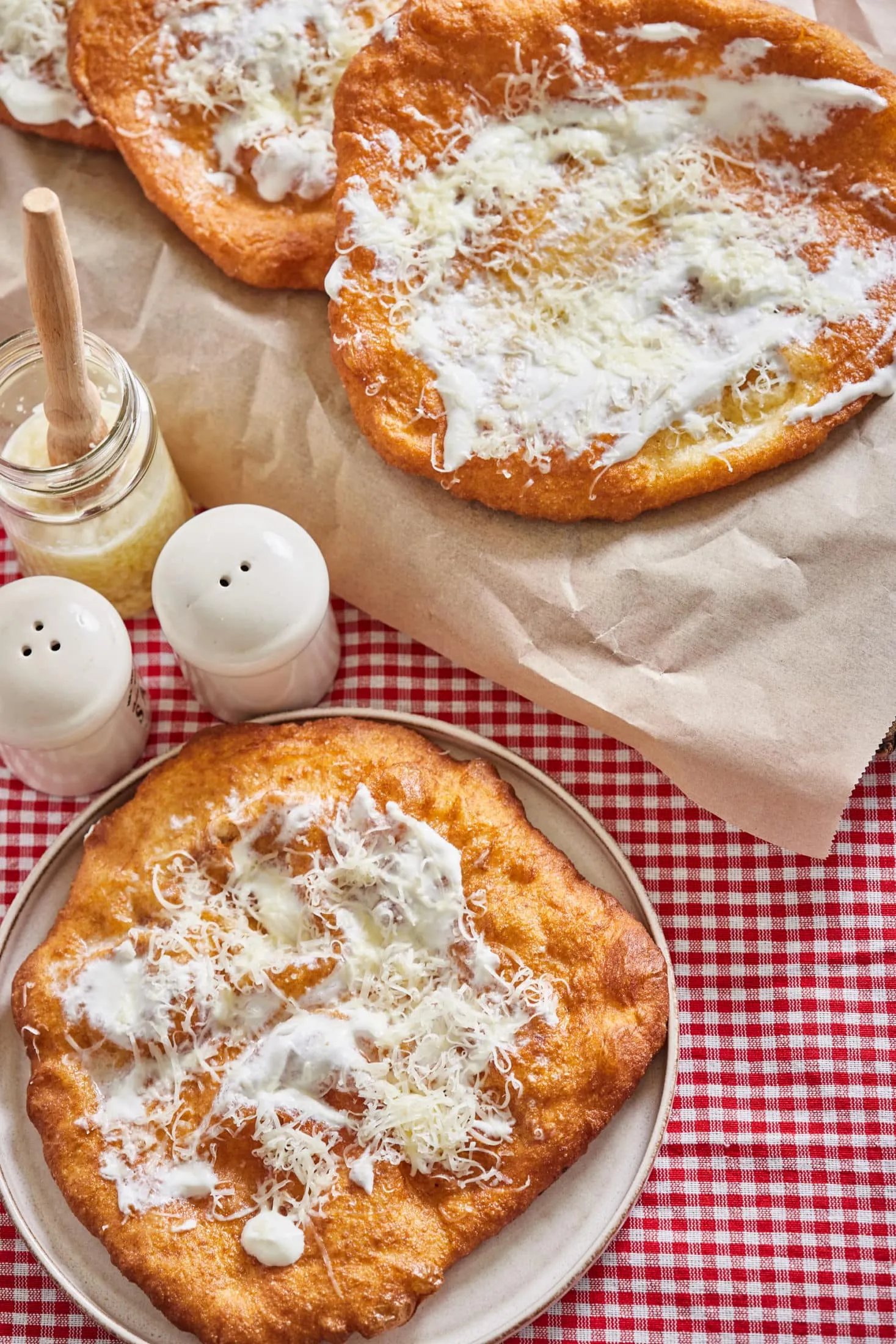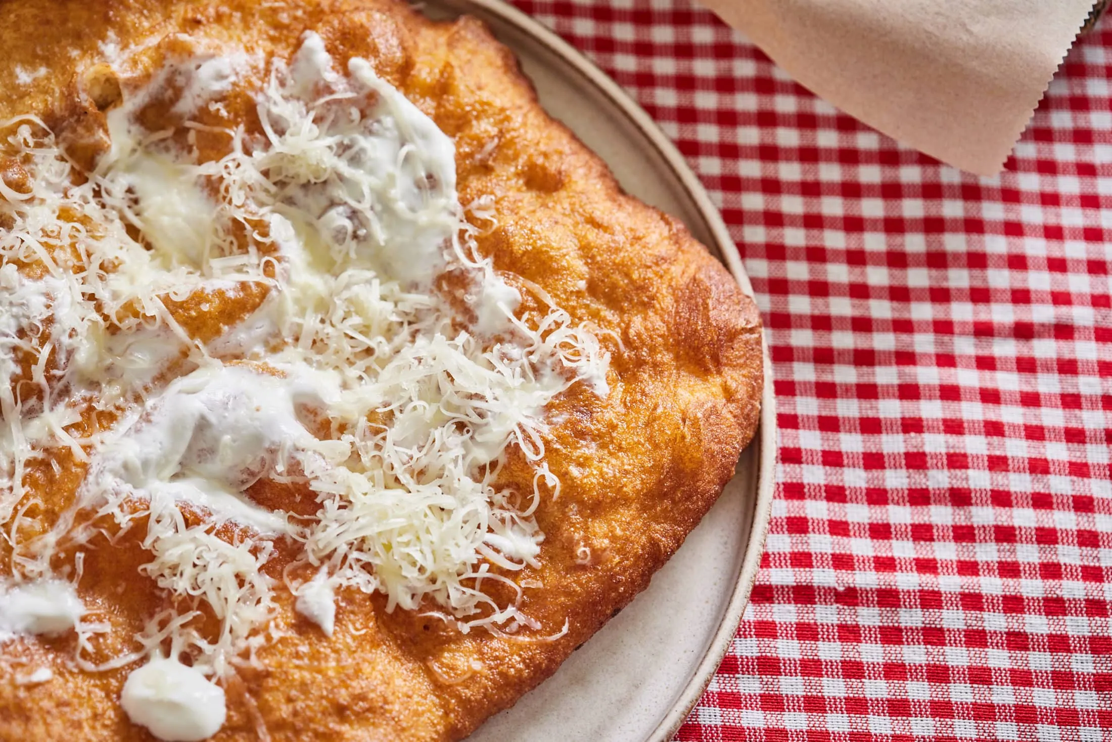 Ezután lisztezett felületre borítjuk a tésztát, és 10-12 egyenlő részre osztjuk. A kiadagolt tésztából gömböket formázunk, és egy vékonyan kiolajozott zárható dobozban még fél óráig kelesztjük. Olajos kézzel kör alakúra formázzuk a megkelt tésztákat, és 200 fokos olajban mindkét oldalukat aranybarnára sütjük. Zúzott fokhagymával, tejföllel és reszelt sajttal tálaljuk.