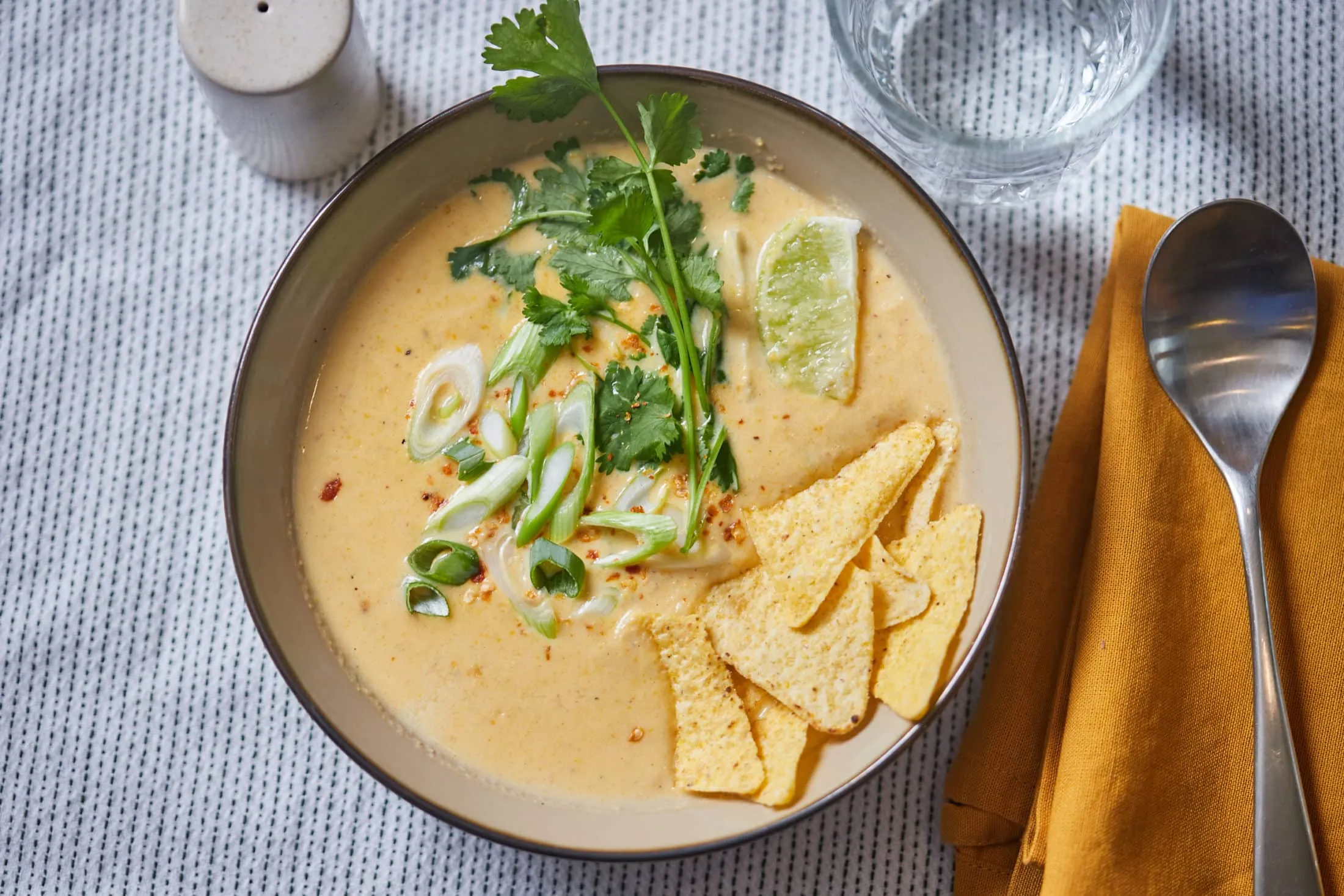 Egyet forralunk rajta, majd egy botmixer segítségével az egészet leturmixoljuk. A megszokottnál kicsit tovább turmixoljuk, ugyanis a kukorica héja ezt igényli. Tányérba szedjük a levest és karikára vágott újhagymával, friss korianderrel, limegerezddel, chilipehellyel és a tortillachipsszel tálaljuk.