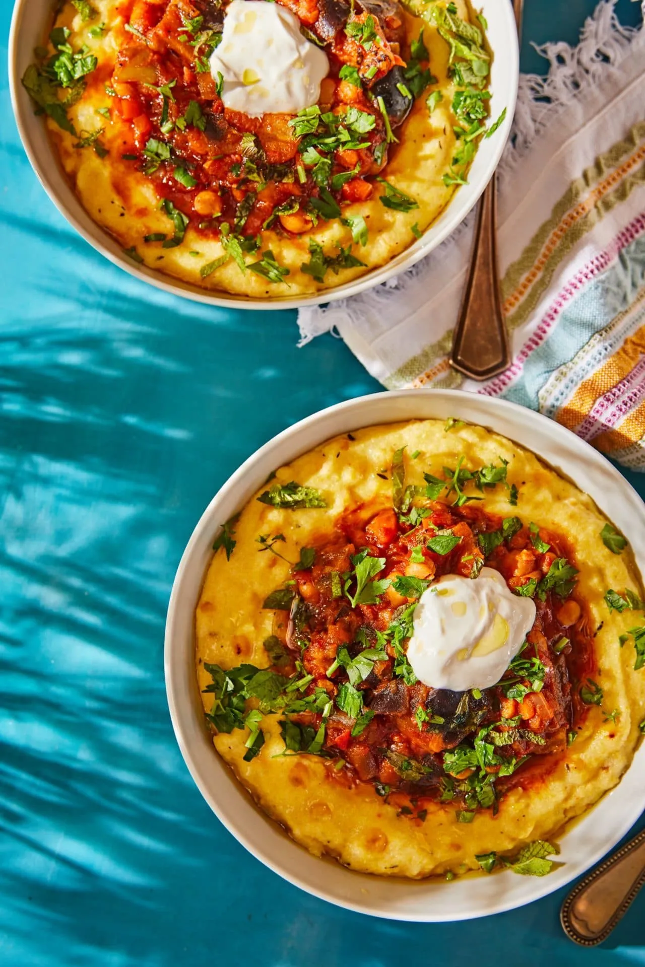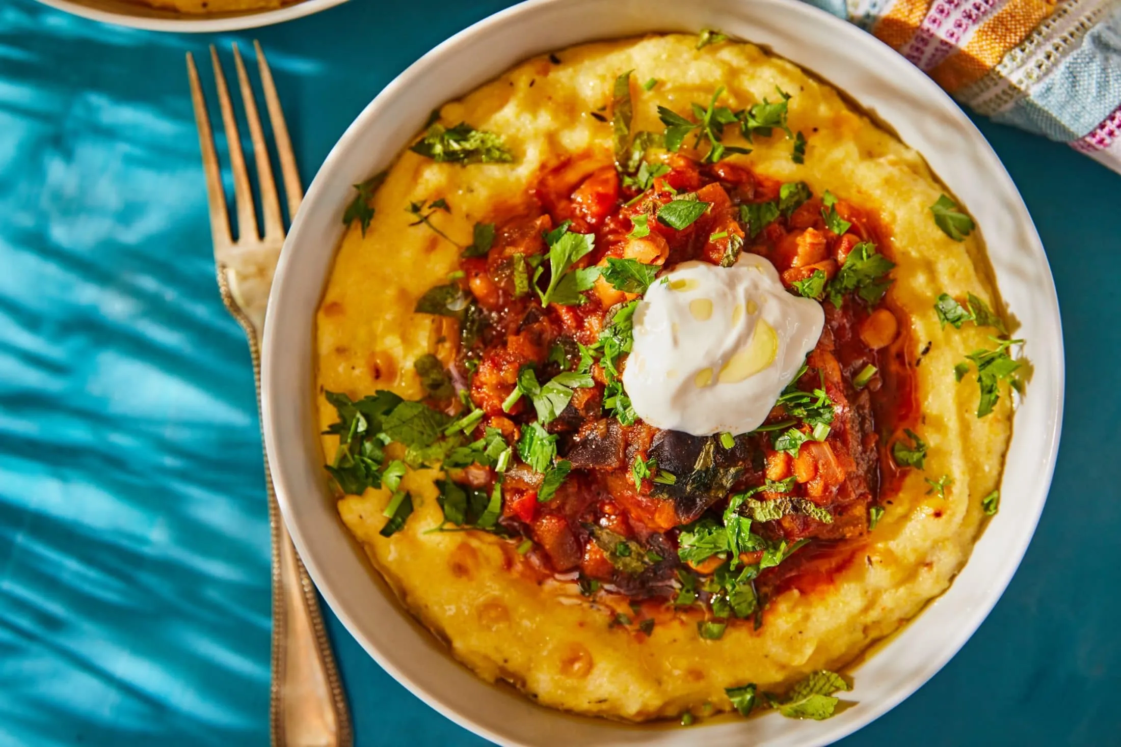 Amíg sül, jöhet a polenta: a kukoricát jó alaposan lecsepegtetjük, és 2 ek olajon addig pirítjuk amíg egy kis színt nem kap, majd megszórjuk a kakukkfűvel. Egy másik edényben felforraljuk az alaplevet, beleöntjük a tejet, a kukoricadarát, sózzuk, borsozzuk, és ha besűrűsödött, mehet a többi hozzávaló is, a kukoricával együtt. Ha kész a ragu, megszórjuk a friss felaprított fűszerekkel, egy kevés labneht vagy joghurtot teszünk rá, és a polentával tálaljuk.