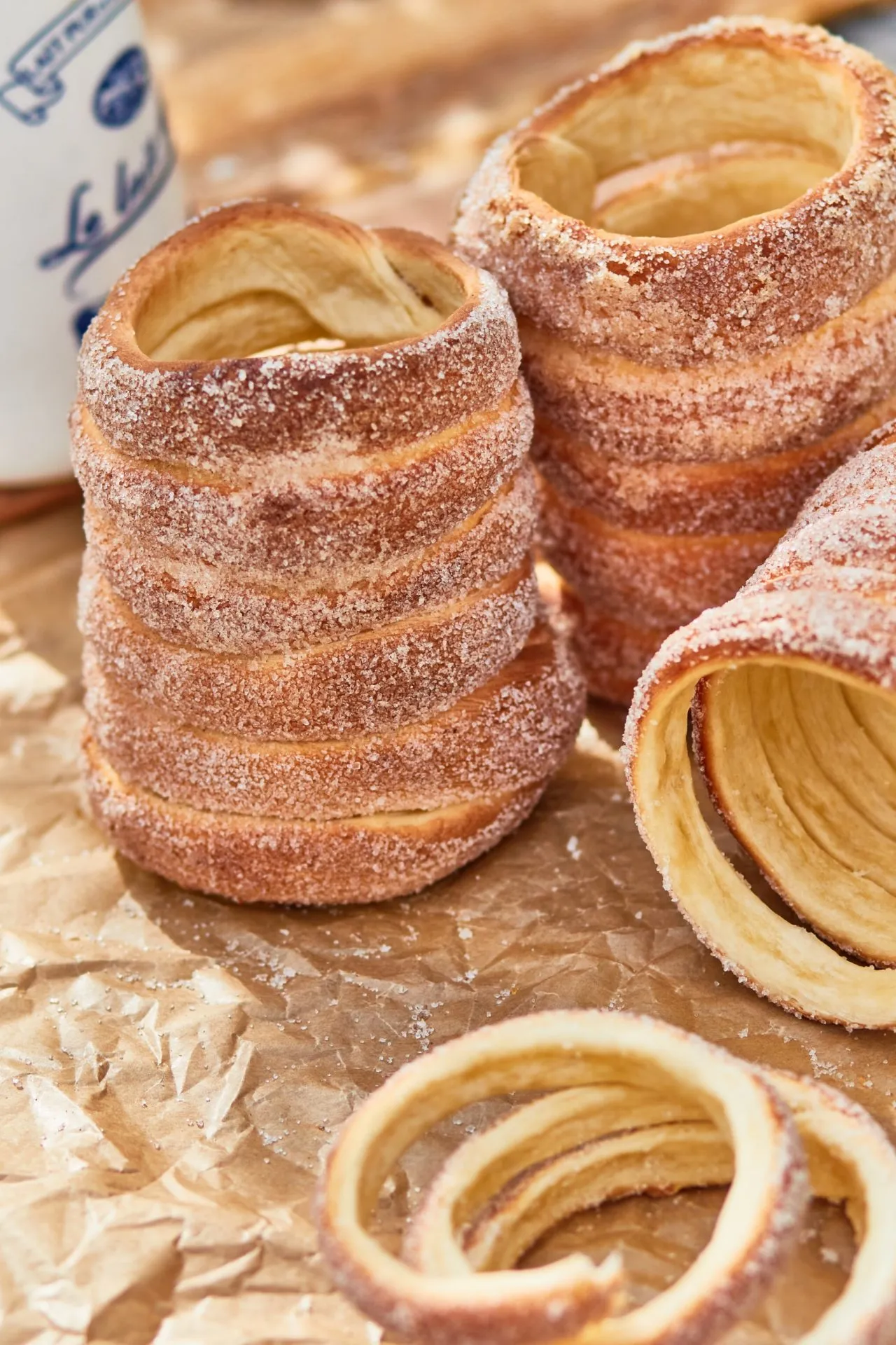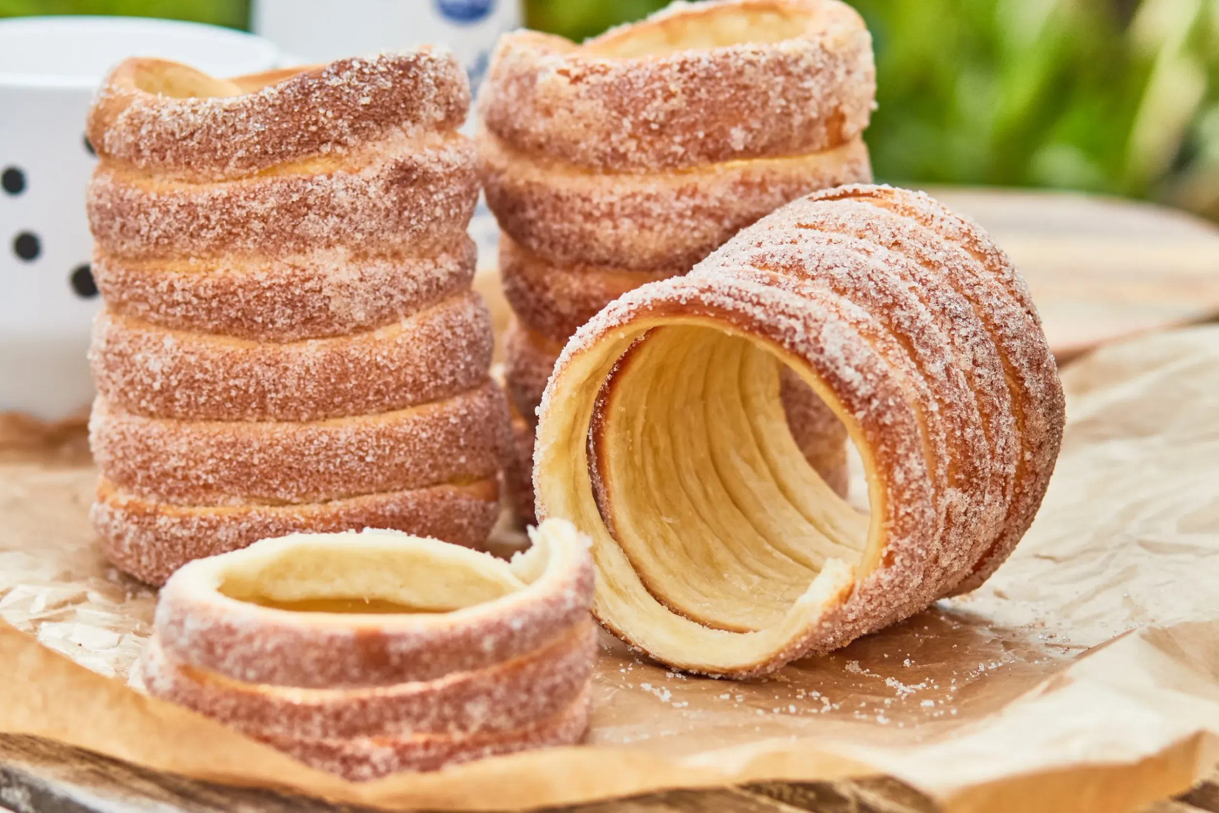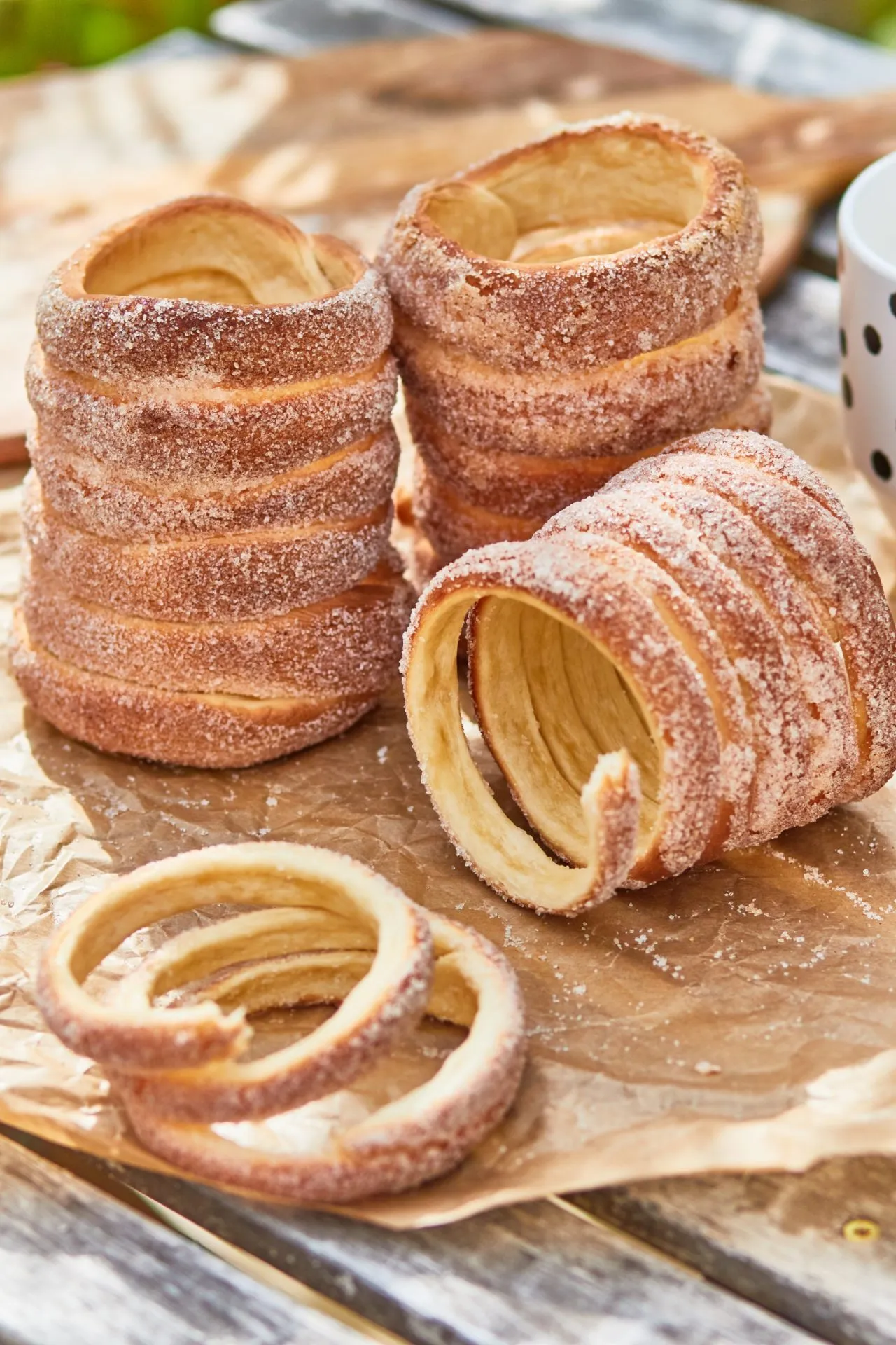 A kürtőskalács tésztájához a tejben elkeverjük a cukrot, és belemorzsoljuk az élesztőt. A lisztben elkeverjük a sót, és hozzáadjuk a tojást és a tejes, cukros élesztőt. Összedolgozzuk, és hozzáadjuk a szobahőmérsékletű vajat, amivel együtt 10 percig dagasztjuk a tésztát, majd egy órán keresztül, langyos helyen kelesztjük.