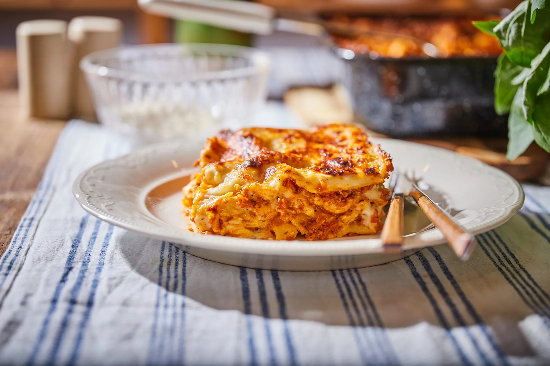 A sütőedényt tepsire helyezzük, mert sülés közben kicsordulhat a töltelék, majd a 200 fokra előmelegített sütőben 45 perc alatt aranybarnára sütjük a lasagnét. Tálalás előtt 25-30 percig pihentetjük, és nagyobb kockákra vágva kínáljuk.
