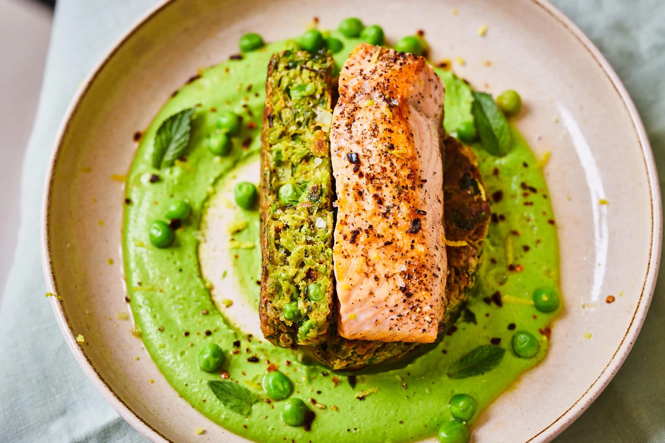 Jöhet is a tálalás, amihez a tányér közepére rakunk egy nagyobb adag zöldborsópürét, és körkörös mozdulatokkal elkenjük a tányéron. A zöldborsófrittereket félbevágjuk, az egyik felet fektetve, a másikat pedig a fektetett mellé, a vágott felével lefelé állítva helyezzük. A fektetett zöldborsófritterre tesszük a lazacfilét. Meglocsoljuk citromlével, a pürére szórunk a citrusos zöldborsóból, rakunk rá néhány kisebb mentalevelet, és megextrázzuk egy kevés frissen őrölt chilivel és sóval.
