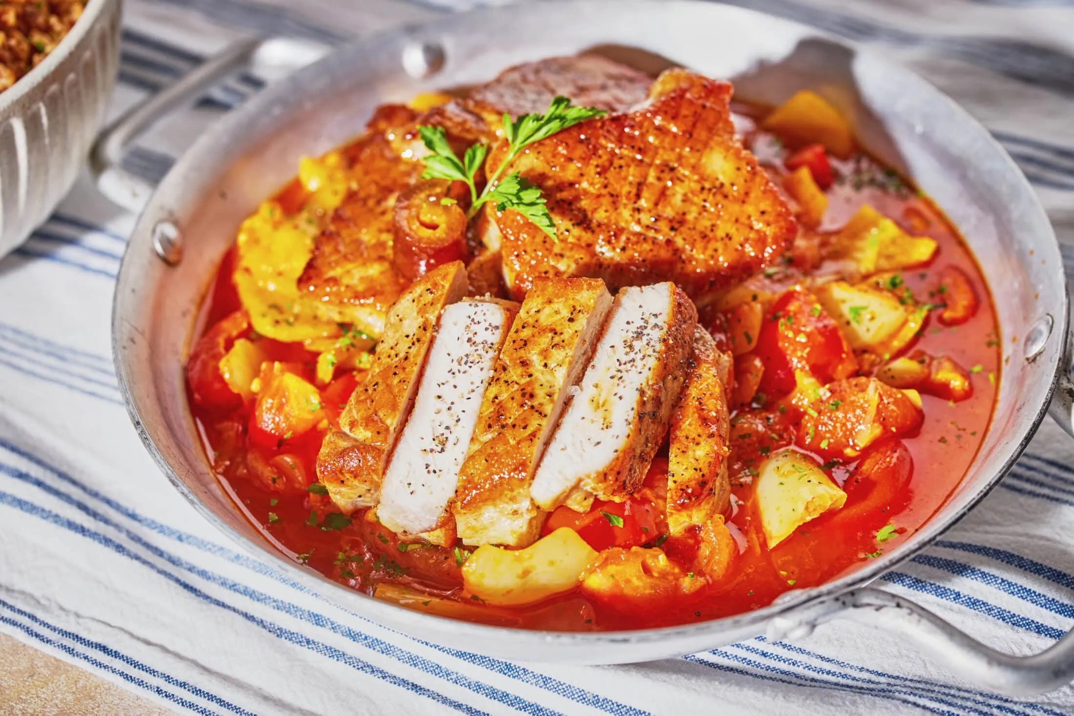 Ha elkészült, tányérra kanalazzuk a lecsót és a karajt, a tetejére pedig frissen vágott petrezselymet szórunk. Köretként mi most tarhonyát pattintottunk mellé, ettől függetlenül nyugodtan csináljátok meg hozzá a kedvenc köreteteket, vagy csak tunkoljátok ki friss kenyérrel. Nem fogtok csalódni!