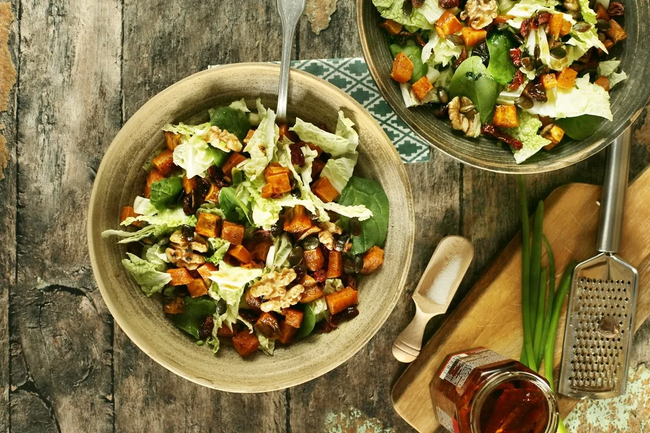 A kelleveleket apróra vágjuk, az aszalt paradicsomot felcsíkozzuk. A saláta hozzávalóit egy tálba szórjuk a sült édesburgonyával együtt, meglocsoljuk az öntettel és jól átkeverjük.