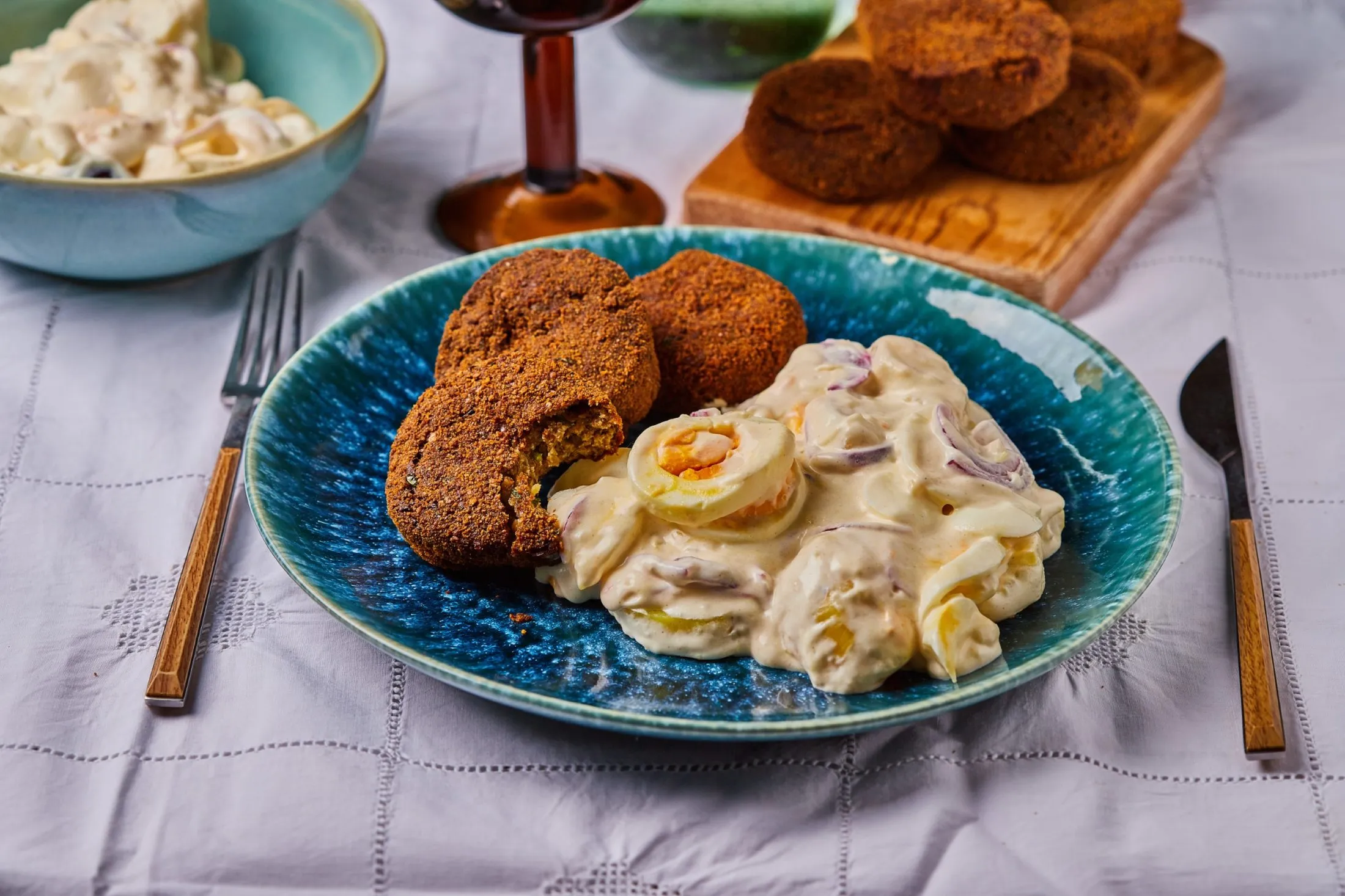 A salátához egy tálban összekeverjük a tejfölt, a majonézt, a mustárt és a porcukrot. A krumplit és a tojást karikákra vágjuk, a lila hagymát kinyomkodjuk, és a tejfölös szószhoz keverjük őket. Tányérra szedjük a salátát, és a lencsefasírttal tálaljuk.