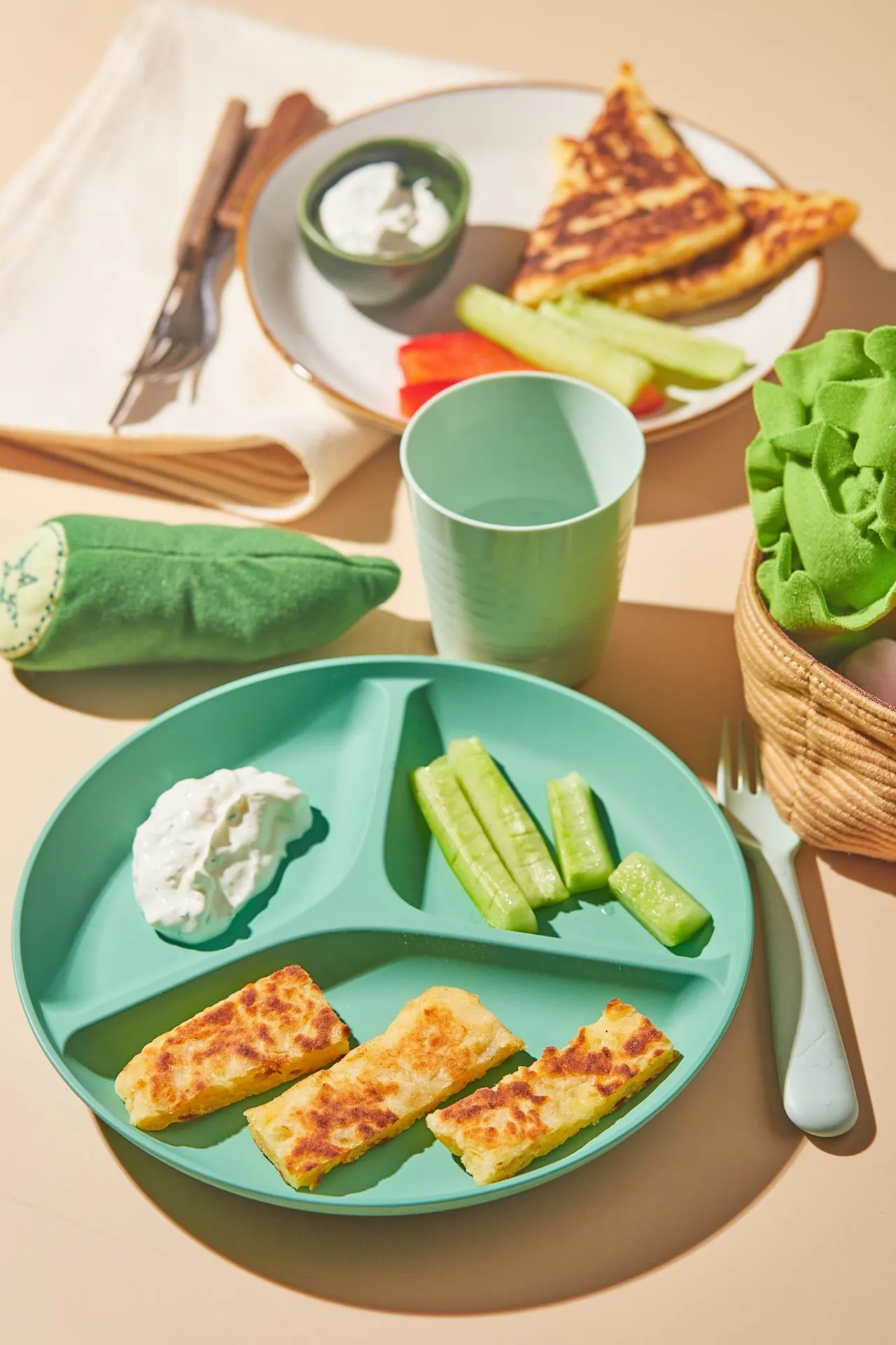 *Olyan zöldségeket válasszunk, amelyeket a baba biztonsággal el tud fogyasztani. Ez jellemzően puha és hámozott, falatonként beirdalt (pl. kígyóuborka, és nem a keményebb paprika) zöldséget jelent. Nagyobb gyerekeknek jöhet a többi zöldség is.