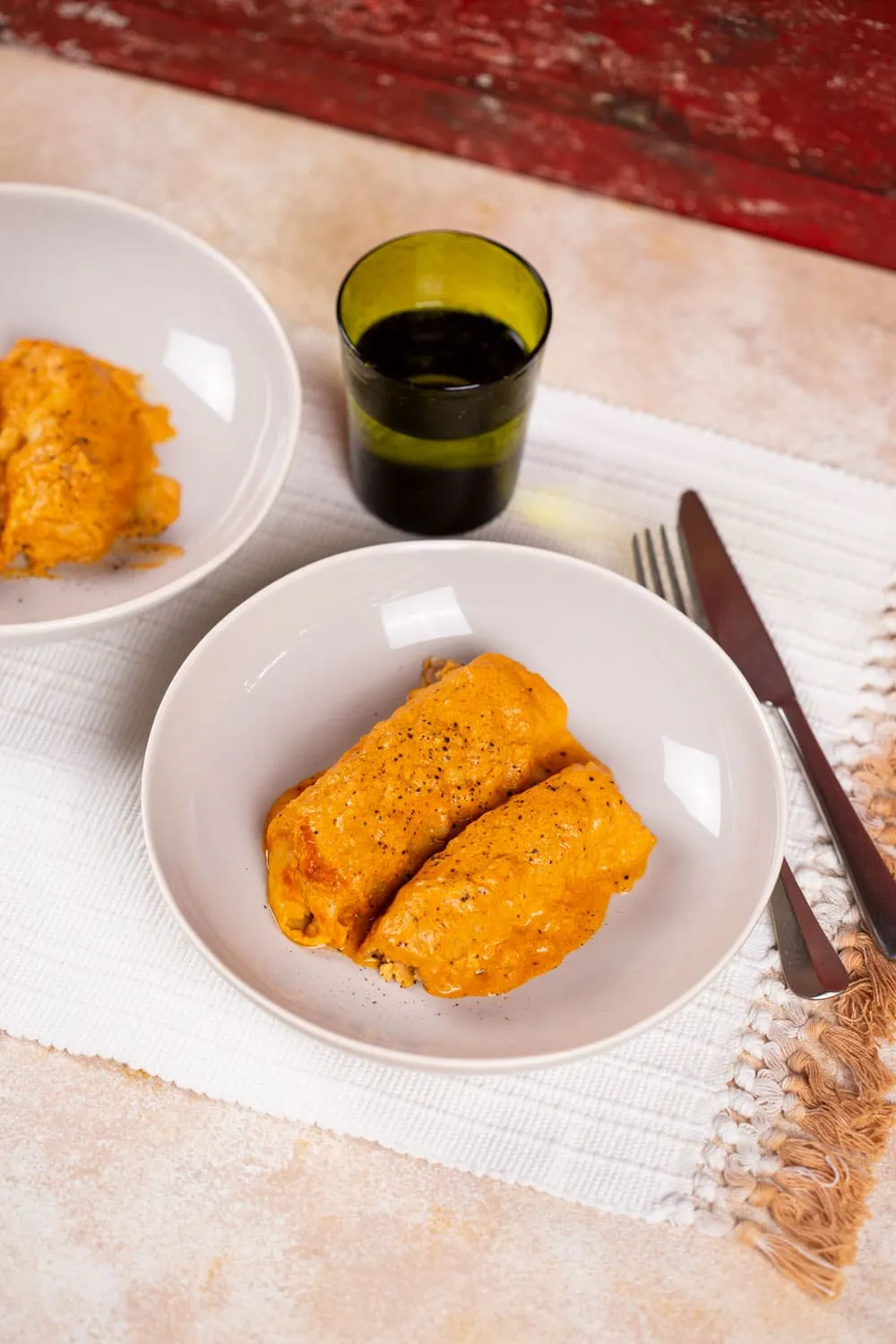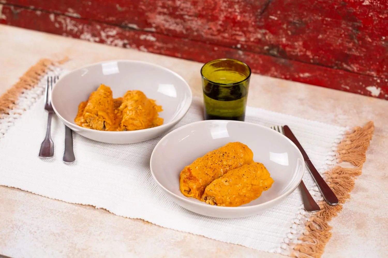 Kb. 2 evőkanálnyit rakunk a csirkéből a palacsintákba, és hagyományos módon feltekerjük, majd egy akkora tepsibe rakjuk, amibe pont belefér. Leöntjük a szafttal, és 200 fokra előmelegített sütőben kb. 20-25 perc alatt megsütjük, és kész is.