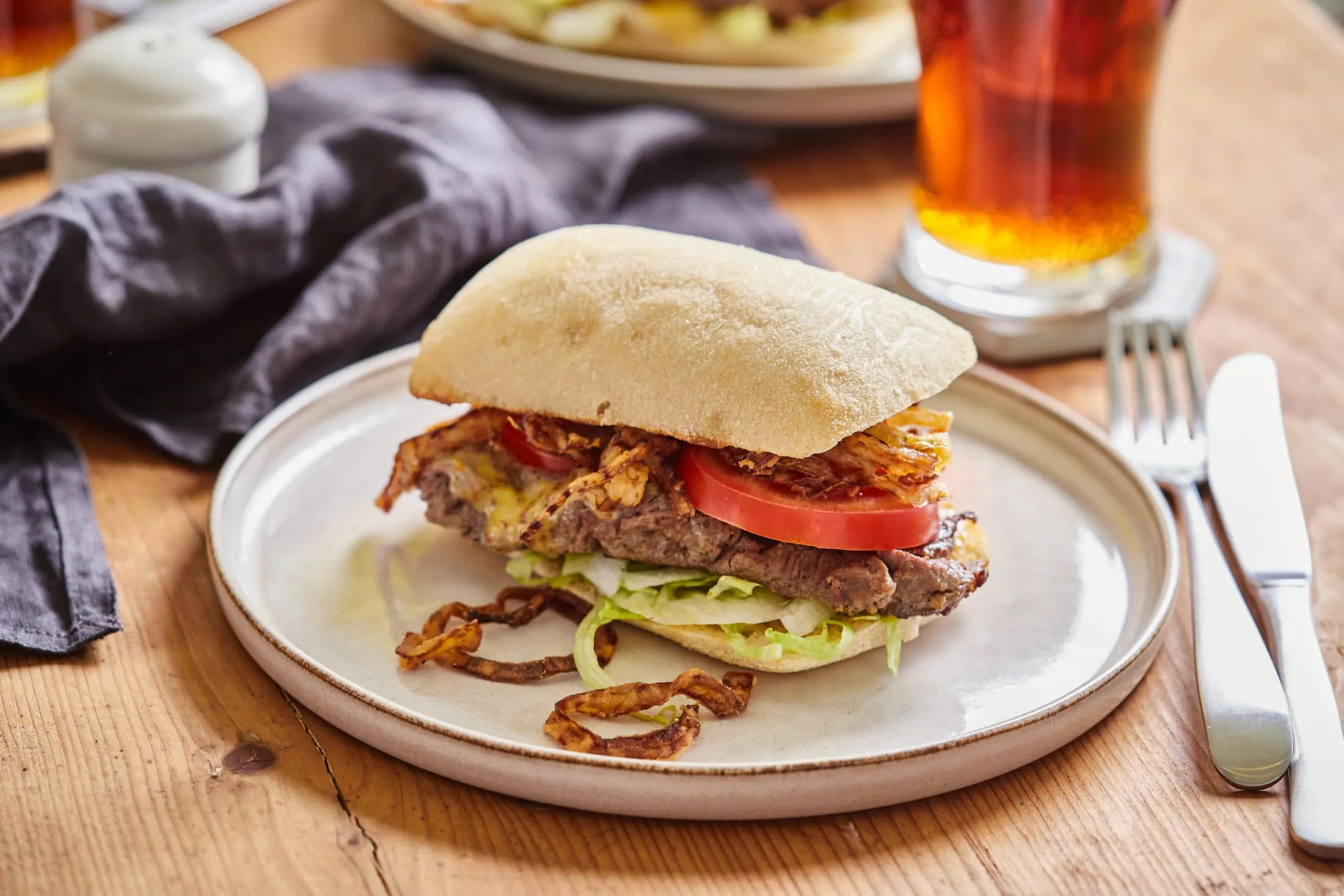 A ciabattákat kettévágjuk, és vékonyan megkenjük majonézzel. Száraz, közepesen forró serpenyőben megpirítjuk a vágott felületüket. A jégsalátát és a paradicsomot felszeleteljük, és már csak az összeállítás van hátra: a ciabattára tesszük a jégsalátát, rápakoljuk a felszeletelt hátszínt. Meglocsoljuk a mézes-mustáros mártással, ráhelyezzük a paradicsomszeleteket, és bőségesen megpakoljuk a sült hagymával. A szendvicset a ciabatta pirított tetejével zárjuk, és egy pohár amber ale társaságában tálaljuk.