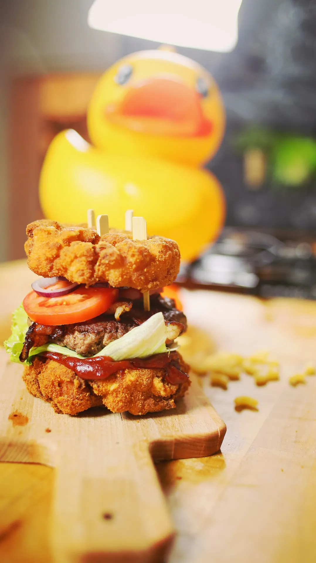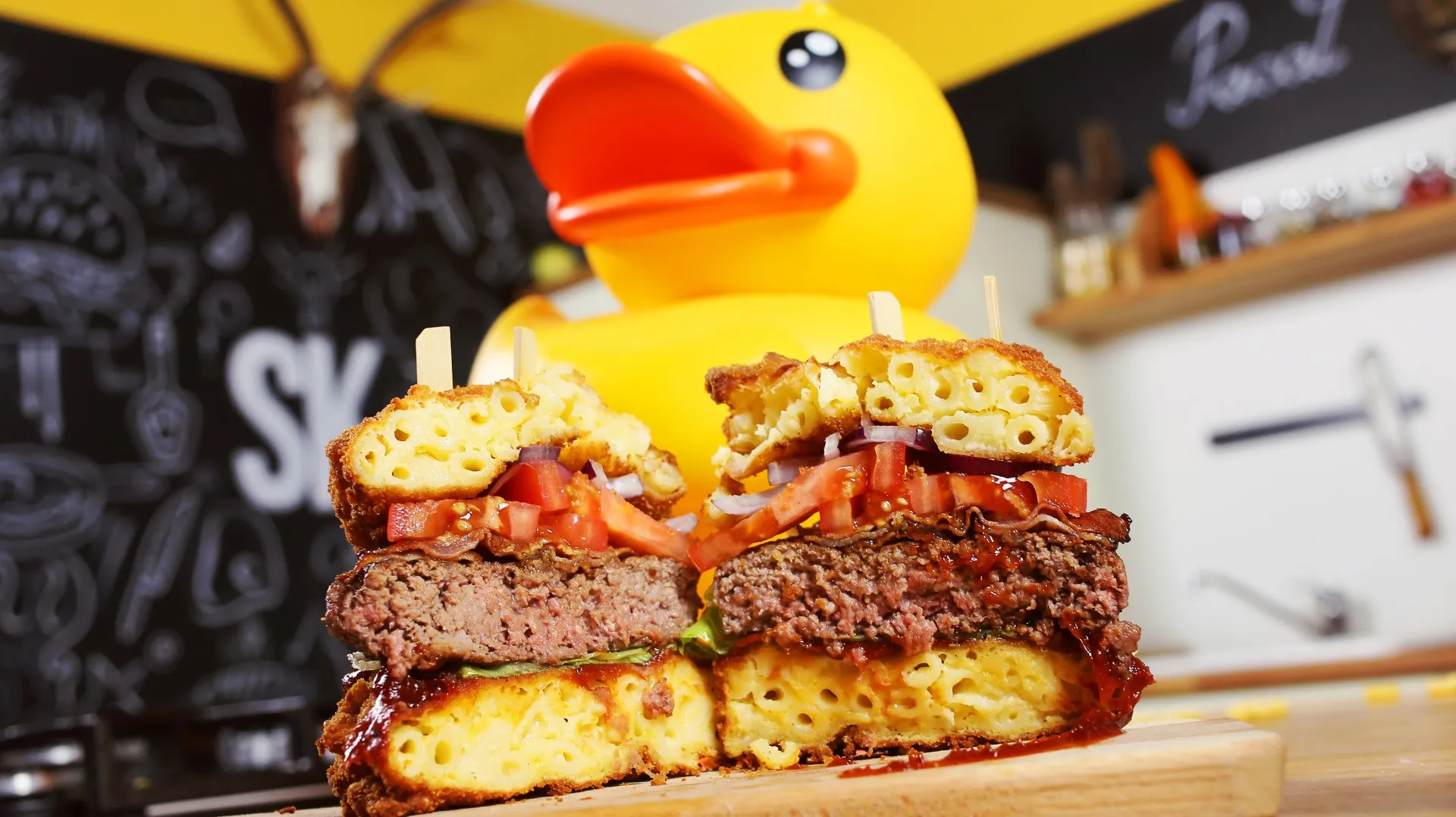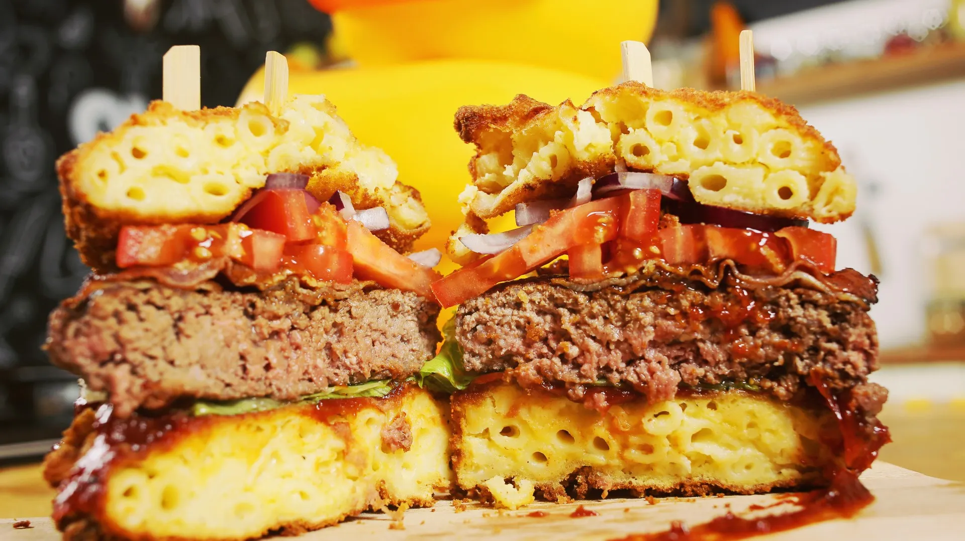 Ha kész vagyunk a szósszal, kisütöttük a húst és a bacont, a lehűtött mac and cheese bucit a klasszikus tanítás szerint panírozzuk. Majd kb 180 fokos olajba tesszük, ahol addig sütjük, míg nem szép, aranybarna külsőt nem kap. Lecsepegtetjük egy itatóspapíron, majd összerakjuk a burgert.
