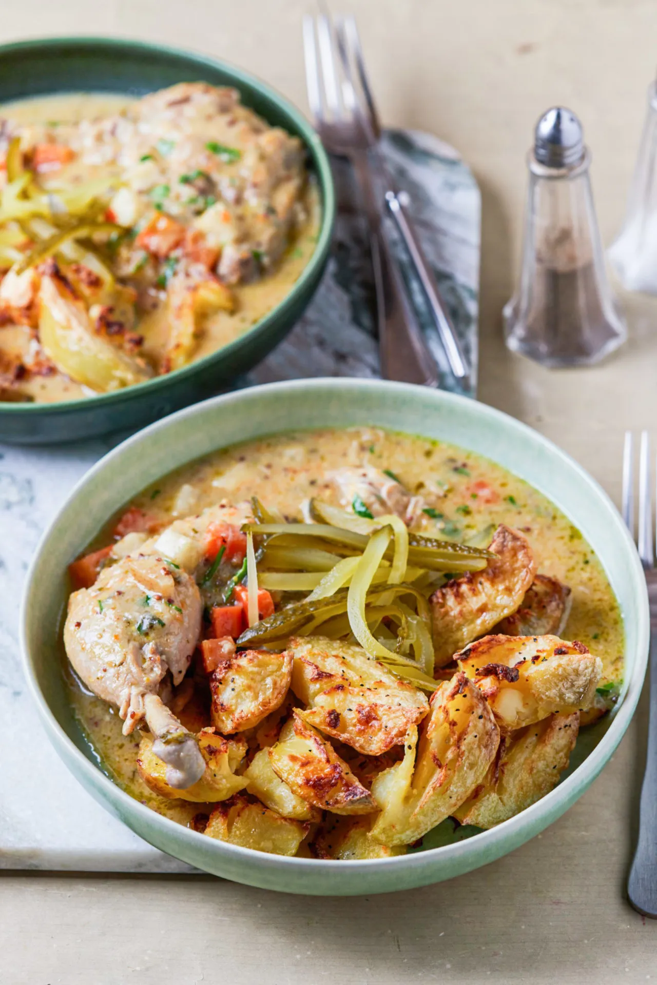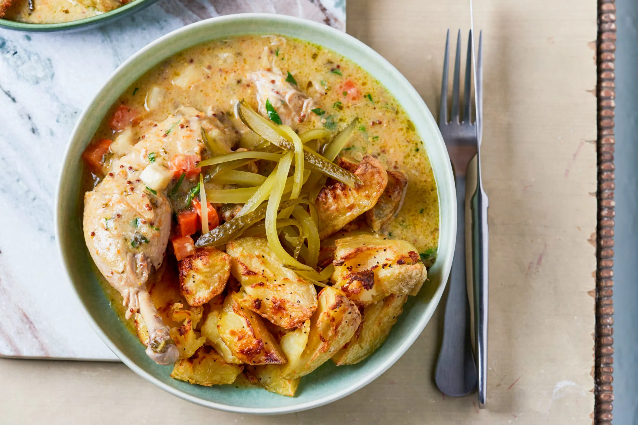 A burgonyákat meghámozzuk és félbevágjuk, majd a maradék zsályával sós, forrásban lévő vízben megfőzzük. Leszűrjük, sütőpapírral bélelt tepsire tesszük, enyhén összenyomjuk egy villával, ízlés szerint sózzuk, borsozzuk, meglocsoljuk pár evőkanál olajjal, majd 230 fokra előmelegített sütőben 30-40 perc alatt extra ropogósra sütjük. Az uborkát vékony csíkokra vágjuk. A ragut a krumplival és uborkával fogyasztjuk.