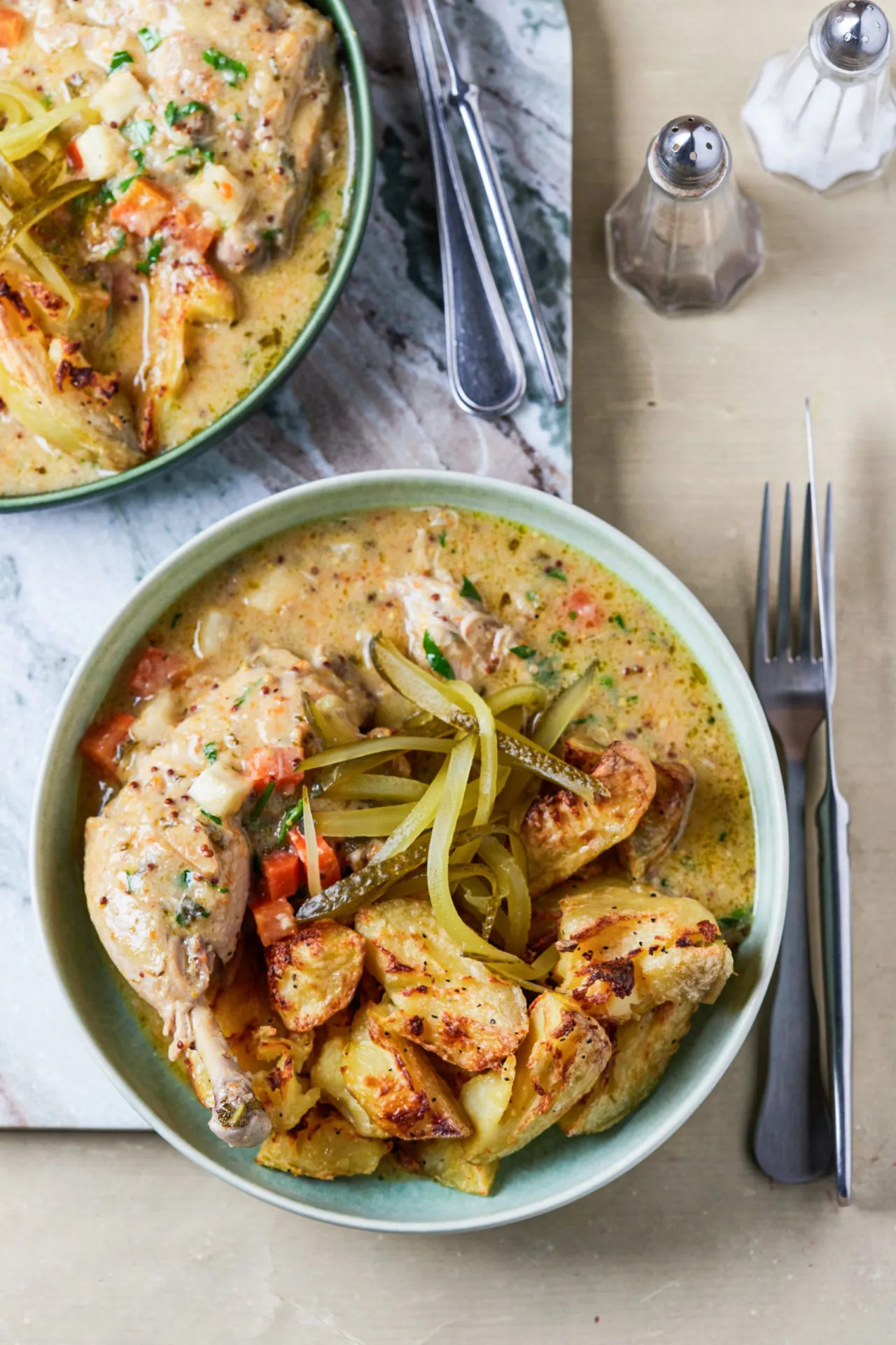 A csirkecombokat magas hőmérsékleten előpirítjuk egy lábasban az olajon, majd kiszedjük és félretesszük. A felaprított hagymát, finomra reszelt sárgarépát és fehérrépát, aprított fokhagymát lepirítjuk a lábasban, majd felöntjük a fehérborral, és elforraljuk. Ezután felöntjük az alaplével és a tejszínnel, és az egészet egy botmixerrel turmixoljuk. Visszatesszük a combokat, hozzáadjuk a magos mustárt, ízlés szerint sózzuk, borsozzuk, a zsálya felét finomra aprítjuk, és azt is beletesszük. Az egészet addig főzzük, amíg a csirke háromnegyedig meg nem főtt, majd beletesszük a sárgarépa- és zellerkockákat, és puhulásig főzzük. Ha szükségesnek tartjuk, 1 evőkanál kukoricakeményítővel sűríthetjük a mártást, végül megszórjuk aprított petrezselyemmel.