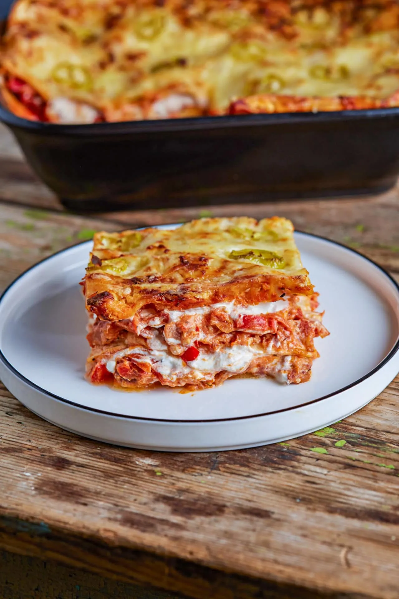 Egy kerámiatálat kiolajozunk, és az alját kibéleljük a tészta harmadával. Erre kanalazzuk a ragu felét, majd a fehér szósz felét, és megszórjuk egy kevés reszelt sajttal. Ezután jön a következő adag tészta, majd a ragu és a szósz, végül az utolsó réteg tészta, és rá a sajt. A tetejére karikázhatunk erős paprikát.