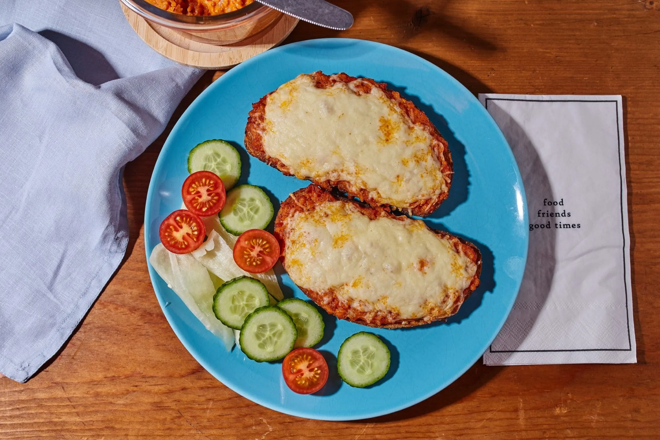 A kenyereket megkenjük a krémmel, rájuk reszeljük a sajtot, és forró sütőben pirulásig sütjük őket. Tetszőleges zöldségekkel már falhatjuk is.
