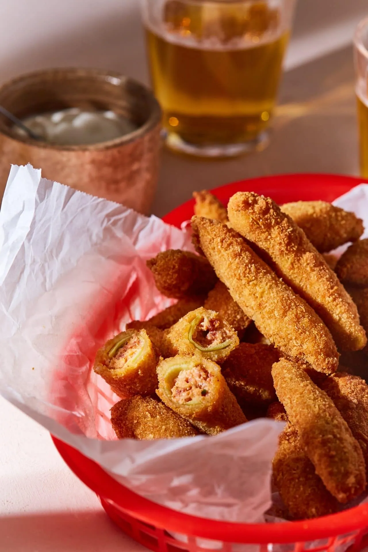 A tojást felverjük, és a fél paprikákat először a lisztbe, majd a tojásba, végül a morzsába forgatjuk. Az olajat 170-180 fokosra melegítjük, és a kis poppereket aranybarnára sütjük benne, majd törlőpapíron leitatjuk. Egy kis tejföllel kínáljuk.