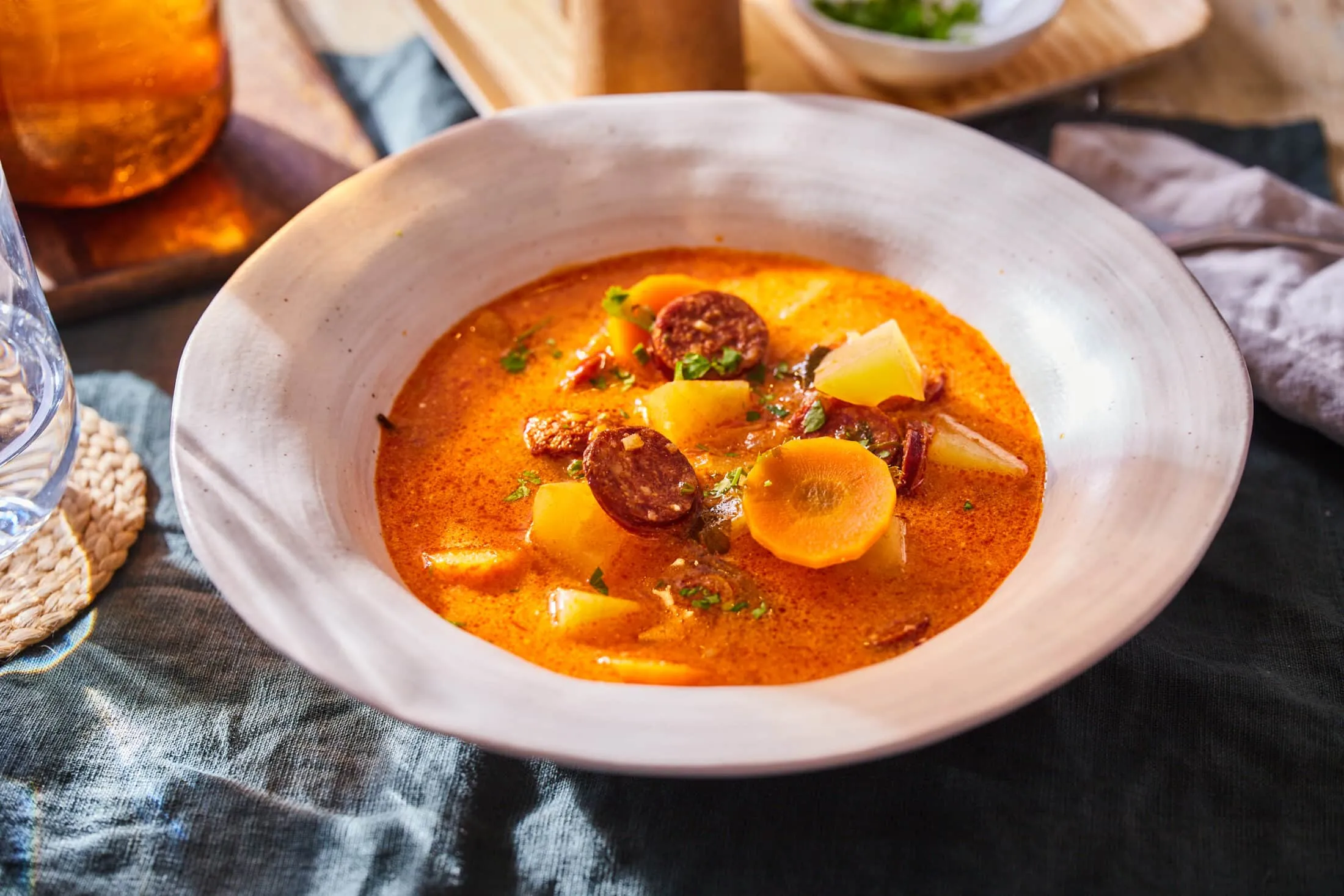 Hozzáadjuk a karikára vágott répát és a megtisztított, kb. 2 cm-es darabokra vágott krumplit, és közepesen erős hőfokon további 1-2 percig pirítjuk. Hozzáadjuk a daráltpaprika-krémet, a fűszerpaprikát, átkeverjük, és felöntjük az alaplével. (Amennyiben nincs alaplevünk, a víz is megteszi.) Amikor felforrt, hozzáadjuk a petrezselymet, sózzuk, borsozzuk, és közepes hőfokon kb. 20 perc alatt készre főzzük.