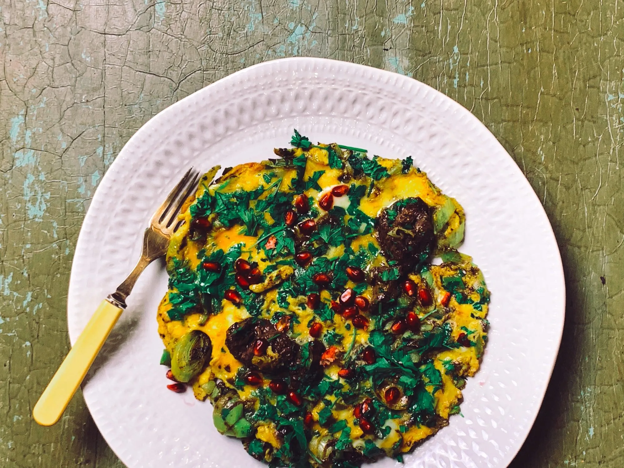 A legvégén megszórjuk apróra vágott petrezselyemmel és/vagy újhagymával, tálaláskor pedig a gránátalmamagokkal.