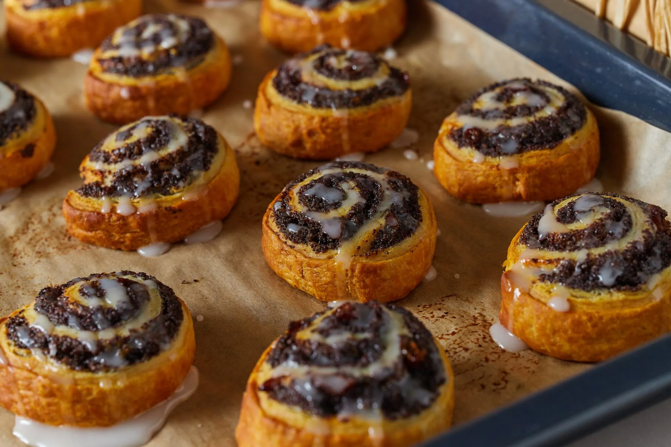 A tésztát kiterítjük és megkenjük a mákos-mazsolás töltelékkel. Szorosan felgöngyöljük, és 2 cm-es szeleteket vágunk belőle. Egy sütőpapírral bélelt tepsire helyezzük a csigákat, egymástól 3 cm távolságra, és betesszük sütni 170 fokra előmelegített sütőbe 15 percre.