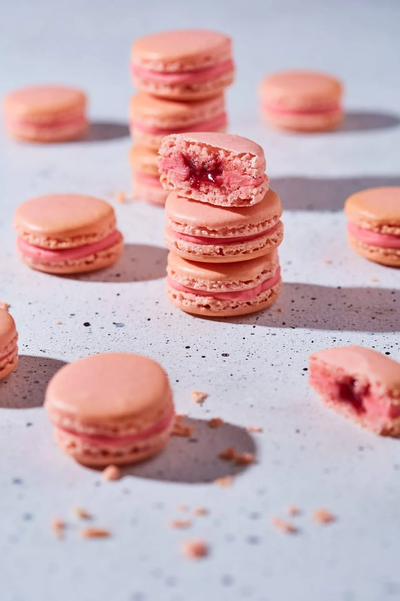 Habzsákba töltjük az alapot, és kb. 2,5 cm-es korongokat nyomunk belőle egy sütőpapíros tepsire, majd 2-3-szor jól odacsapjuk az asztalhoz a tepsit, hogy a légbuborékok kijöjjenek a tésztából és szépen elterüljenek a macaronok.