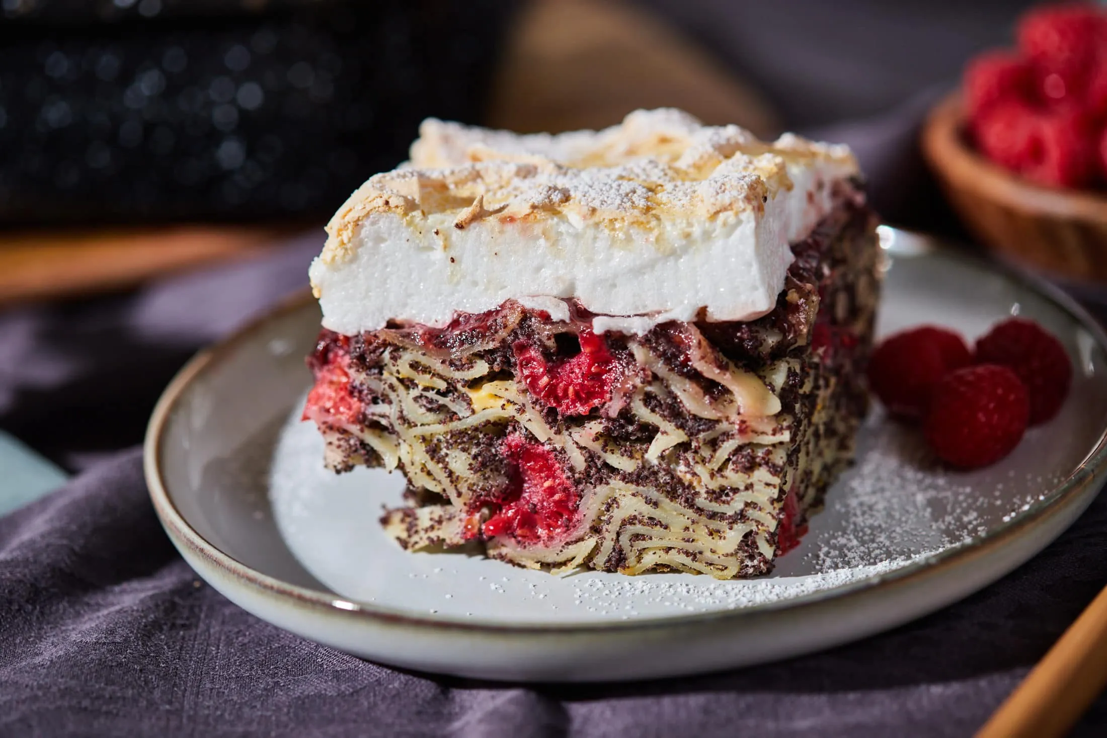 A megsült tészta tetejére simítjuk a málnalekvárt, majd erre a tojáshabot, és 10 percig még sütjük a sütőben. Mikor langyosra hűlt, már szépen tudjuk szeletelni és tálalni.