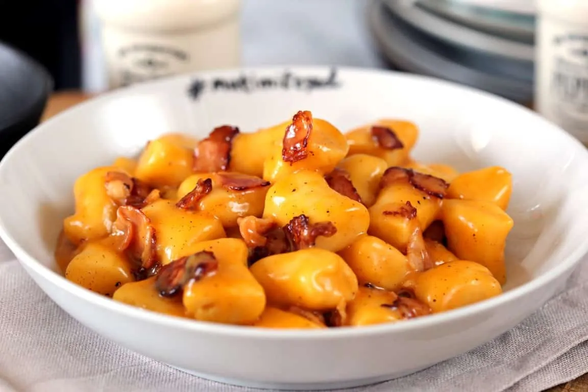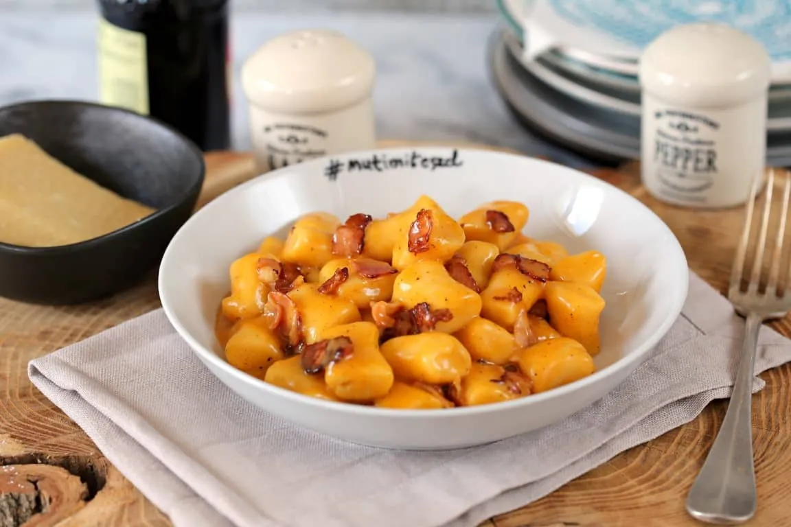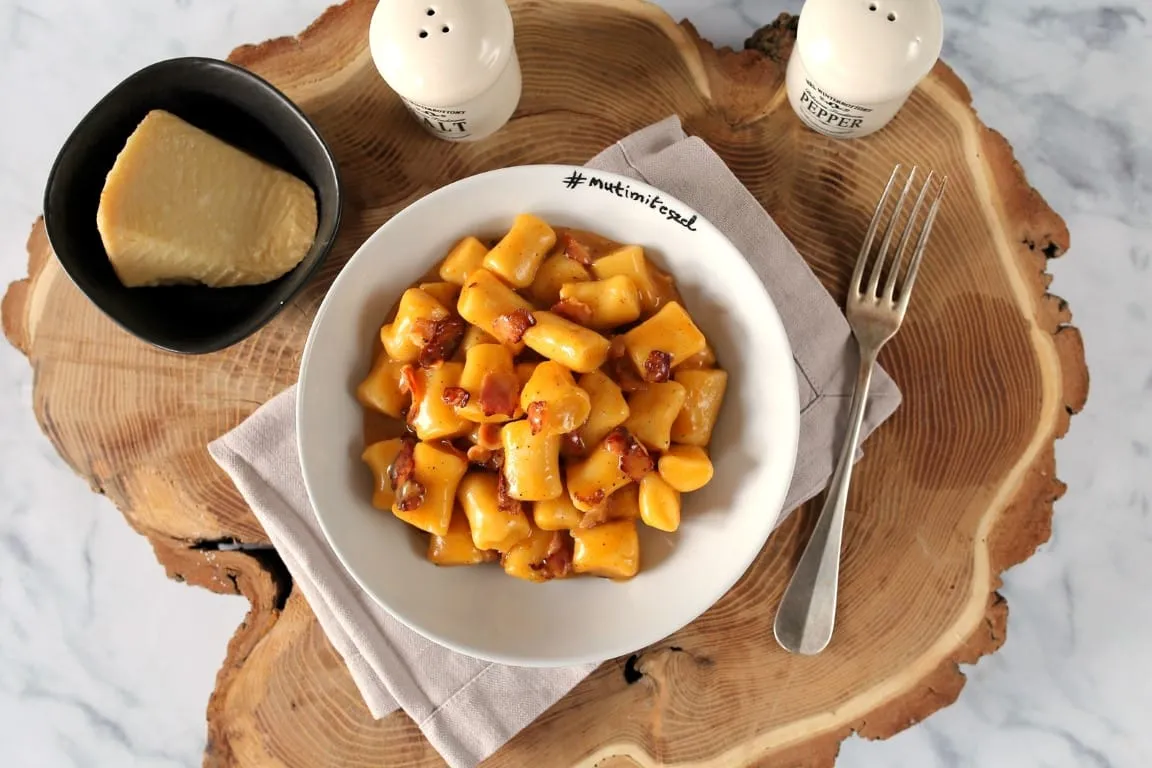 A gnocchihoz a krumplit héjastul megfőzzük mikróban (legmagasabb fokozaton, kb. 10-12 perc, amíg teljesen megpuhul), vagy hagyományos módon. A főtt krumplinak lehúzzuk a héját és egy krumplinyomóval egy nyújtódeszkára vagy egy teljesen tiszta konyhai munkalapra terítjük és megvárjuk, míg kézmelegre hűl. Ekkor jöhet a liszt, majd a tojássárgája, mindkét hozzávaló egyenletesen eloszlatva a krumplin. Só, bors, kis szerecsendió és egy minél kevesebb mozdulattal történő összeforgatás következik. Nem szabad erősen gyúrni, minél könnyedebb és lazább mozdulatokkal csak addig dolgozzunk, míg egyenletesenen összekeveredik a krumpli a liszttel és a tojással. Közben egy nagyobb lábasban felteszünk sós vizet melegedni. A deszkát enyhén belisztezzük, a tészta kb. ötödrészét lecsípjük és a lisztes felületen ügyesen gnocchi vastagságú kukacot hengerelünk a tenyerünkkel és átgörgetjük úgy, hogy finoman lisztes legyen a felülete. Egy éles késsel kb. 3 cm-es darabokat vágunk belőle és a gnocchikat egy liszttel meghintett tányérra pakoljuk. A főzővíznek nem szabad forrnia, csak éppen gyöngyöznie, ekkor jöhetnek bele a gnocchik szépen egyszerre. Az első 2 percben tilos kevergetni, és utána is csak óvatosan egyszer-egyszer. Összesen 8 percig főzzük, majd leszűrjük.