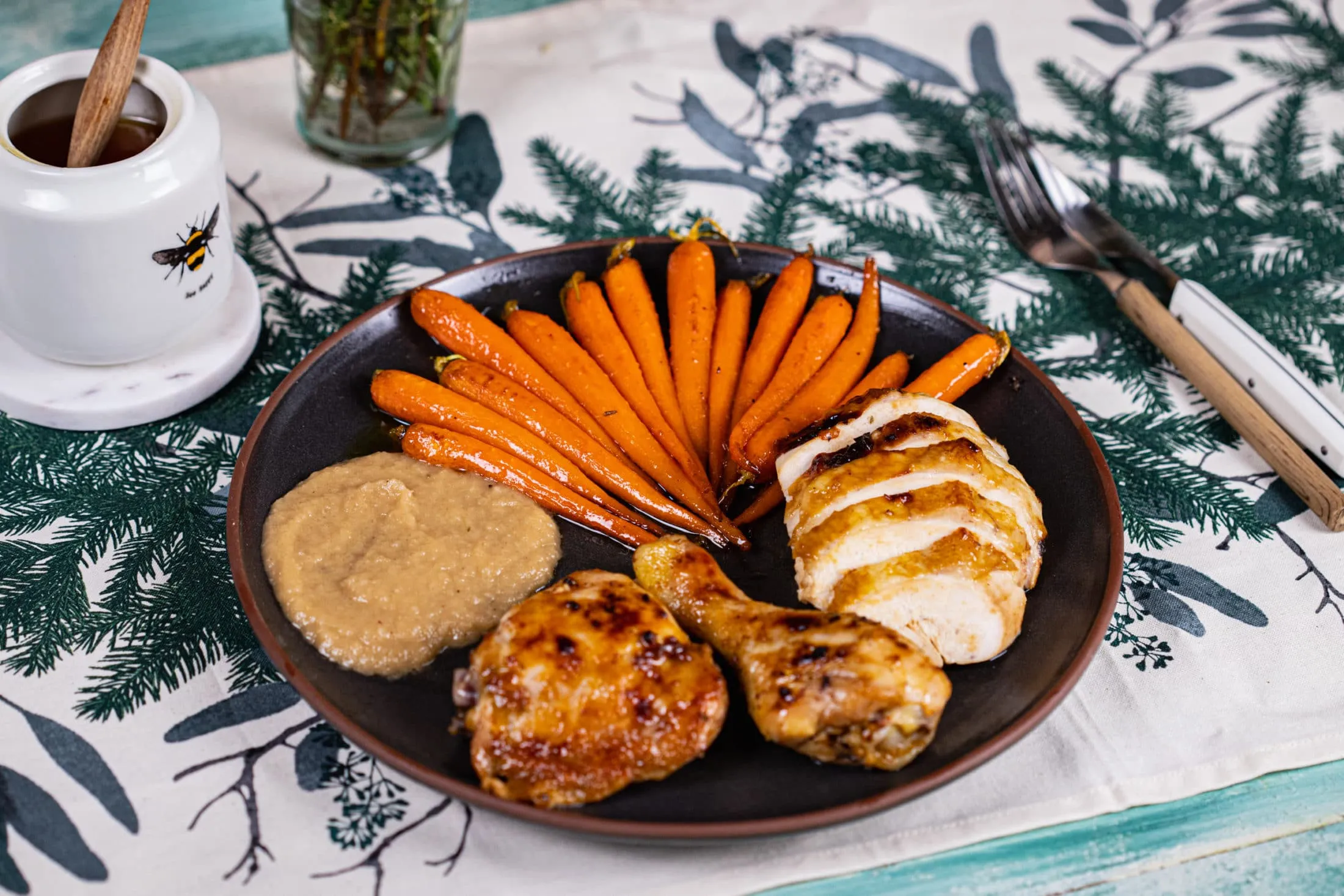 Egy tányérba rakunk a répából, mellé tálaljuk a csirkerészeket, végül szedünk a hagymapüréből, és meglocsoljuk egy kevés mandarinos-mézes szósszal.