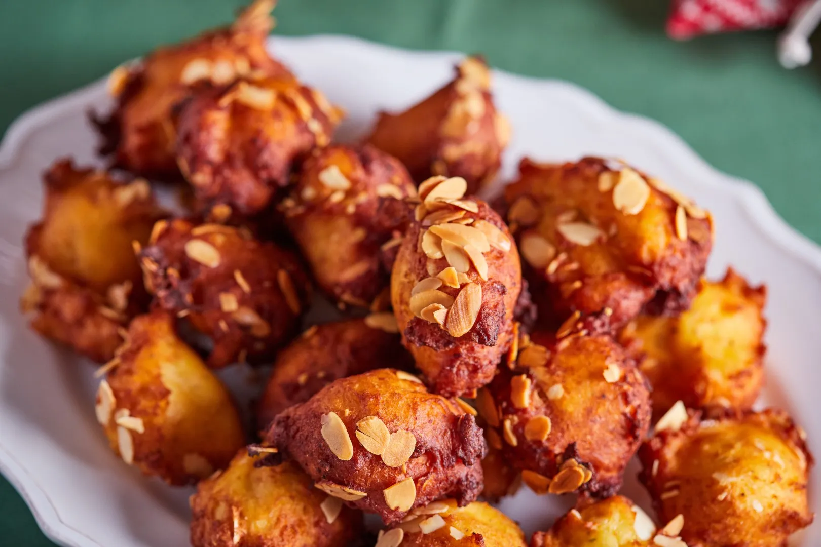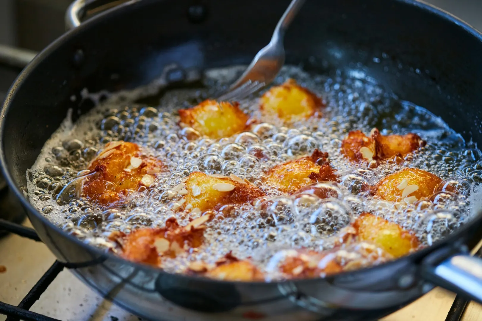 A sütéshez 150-160 fokon tartjuk az olajat. Az olajos kanállal úgy szaggatjuk bele a burgonyás tésztát, hogy a felületét mindig megszórjuk a mandulával. Aranybarnára sütjük és papírtörlőn lecsöpögtetjük.