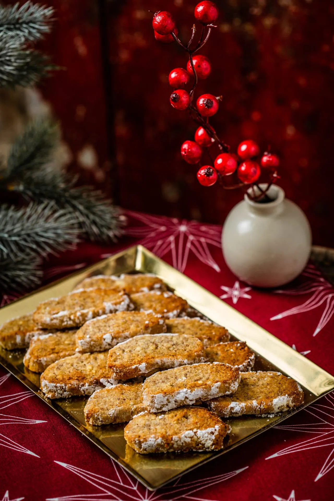 A mandulás keksz tésztájához összekeverjük a mandulalisztet, a cukrot és a mézet. Hozzáadjuk a tojásfehérjét, és jól összegyúrjuk. Egy deszkára szórjuk a porcukrot és hengerré formázzuk a tésztát, majd 1,5 cm-es darabokat vágunk belőle. Mindegyik darabból gombócot formázunk, vagy rusztikusabb formát is adhatunk nekik, majd megforgatjuk őket porcukorban, sütőpapíros tepsire rakjuk, és hagyjuk 2-3 órát, de akár egy éjszakát is száradni. 170 fokra előmelegített, légkeveréses sütőben kb. 15 percig sütjük.
