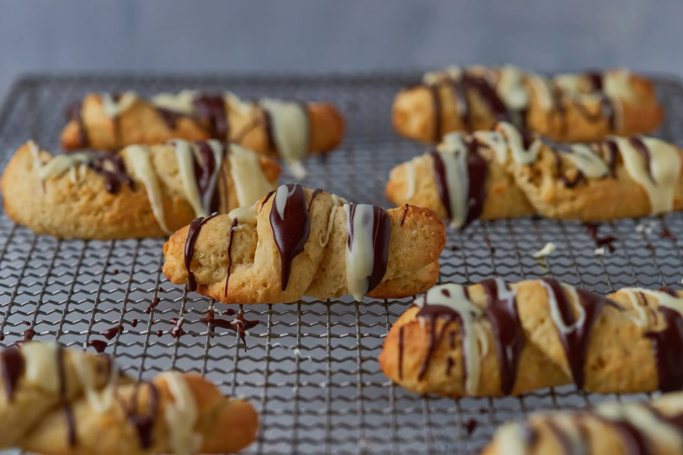 Ezután 16 részre osztjuk a tésztát. (Ha nagyon olvadna, akkor azt a részt, amit éppen nem formázunk, tegyük vissza a hűtőbe egy tálcán.) A darabokat két kis részre osztjuk, 8-9 cm hosszú rudakat sodrunk belőle, majd megcsavarjuk, és sütőpapírral bélelt tepsire tesszük. 180 fokra előmelegített sütőben 15 perc alatt megsütjük. Pár percet hagyjuk hűlni, ezután meglocsoljuk a kétfajta olvasztott csokival. Hűtőbe tesszük annyi időre, amíg kicsit megdermed a csoki.