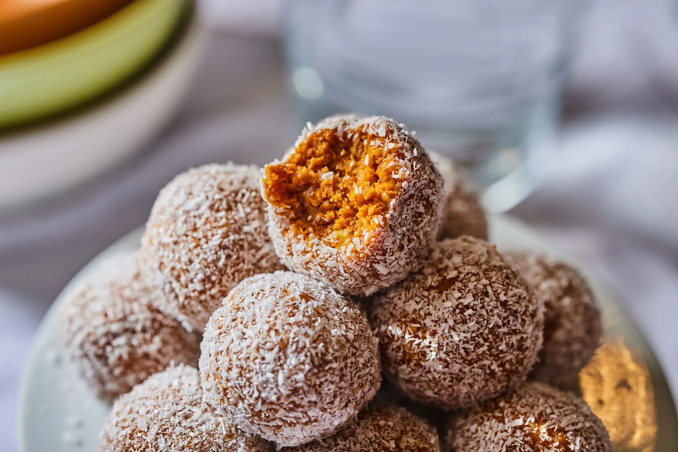 A zabkekszet egy konyhai aprítógépbe tesszük, és morzsalékossá zúzzuk, majd a mandulát is, és egy keverőtálba borítjuk őket. Hozzáadjuk a sütőtökpürét a mézeskalács-fűszerkeverékkel és a vaníliaaromával együtt, és az egészet összedolgozzuk. Kb. 25 grammos, kis dió méretű gombócokat formázunk a masszából, amiket megforgatunk a kókuszreszelékben.