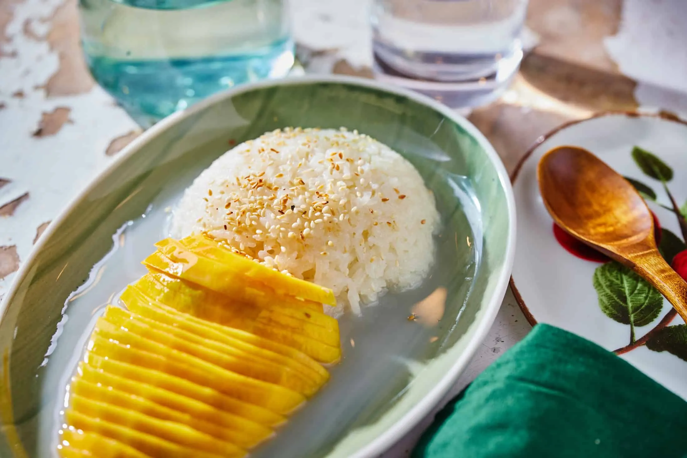 Ez idő alatt a kókusztejet egy kisebb fazékba öntjük, hozzáadjuk a cukrot és pici sót, és alacsony lángon hagyjuk, hogy feloldódjanak, majd félretesszük későbbre. Mikor letelt az 1 óra, a rizst felöntjük a maradék vízzel és a kókusztejes keverék felével, majd közepes lángon felforraljuk. Amikor felforrt, alacsony lángra kapcsolunk, majd lefedve 15 perc alatt puhára főzzük. Amikor lejárt az idő, lekapcsoljuk a tűzhelyet, de még 15 percig hagyjuk, hogy a fedő alatt tovább puhuljon a rizs. Közben felszeleteljük a mangót.