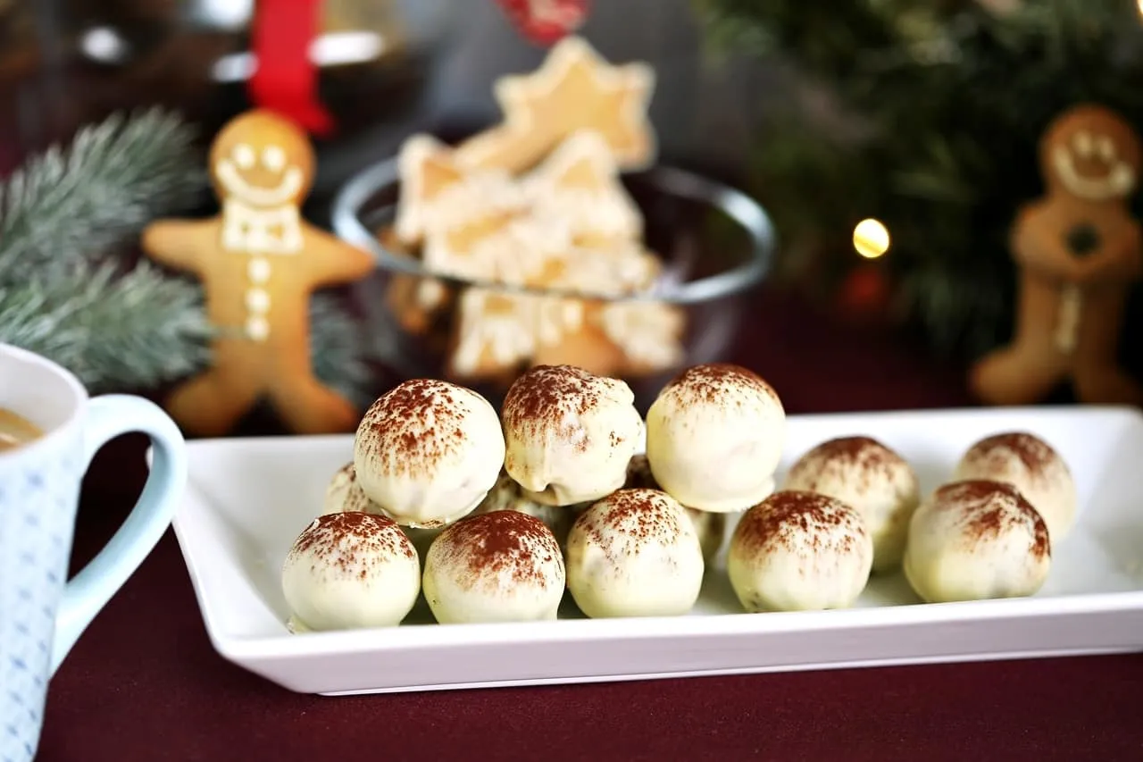 Vízgőz fölött felolvasztjuk a fehércsokit és egy villa segítségével gyorsan beleforgatjuk a megdermedt tésztagolyókat. Sütőpapírral letakart tányérra vagy deszkára rakosgatjuk őket, lecsepegtetve róluk a felesleges csokit, és ha félig megdermedtek, mindegyiket megszórjuk kevés kakaóporral.
