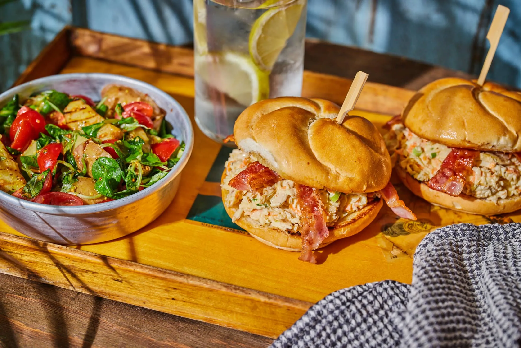 A császárzsemléket kettévágjuk, megpirítjuk a bacon visszamarad zsírjában, és jöhet az összeállítás. A zsemlék alját megpakoljuk a tépett csirkés coleslaw-val, jöhet rá pár szelet bacon, rárakjuk a tetejét, átszúrjuk egy nyárssal és mellé tálaljuk a salátát.
