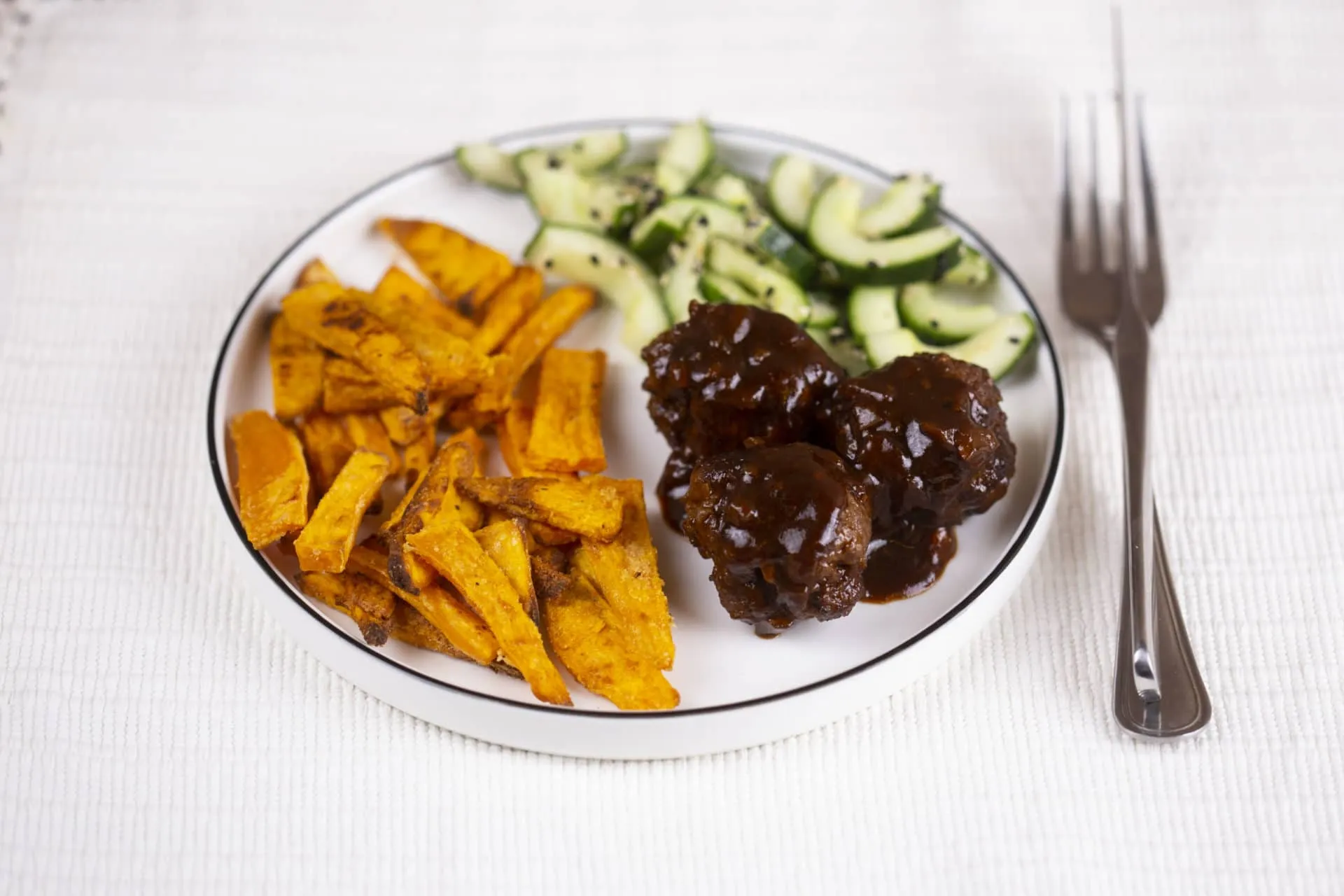 A húsgombócot a sült édesburival és ezzel a salival tálaljuk.