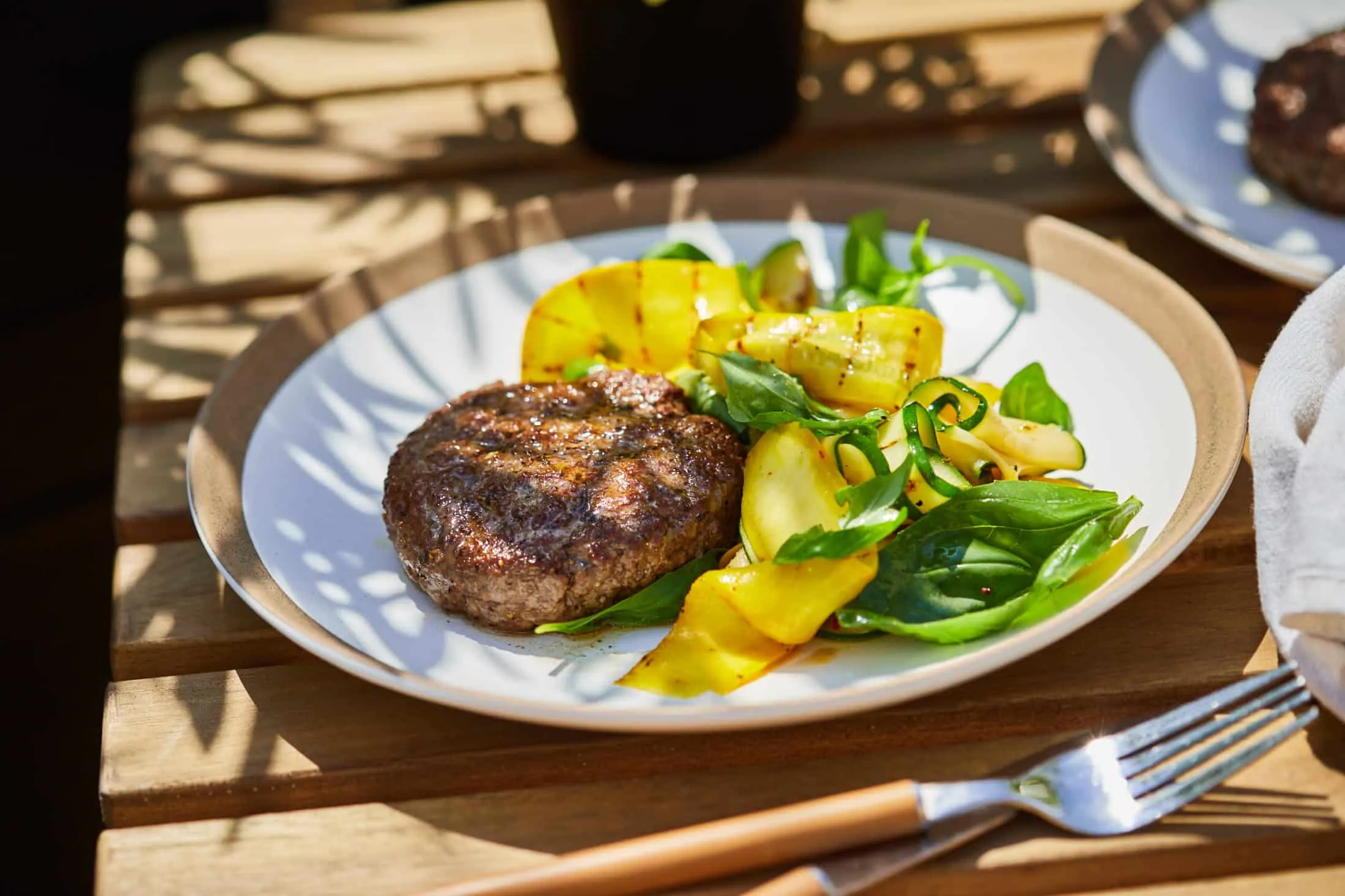 Marhahúspogácsa grillezett marinált cukkinivel és bébispenóttal