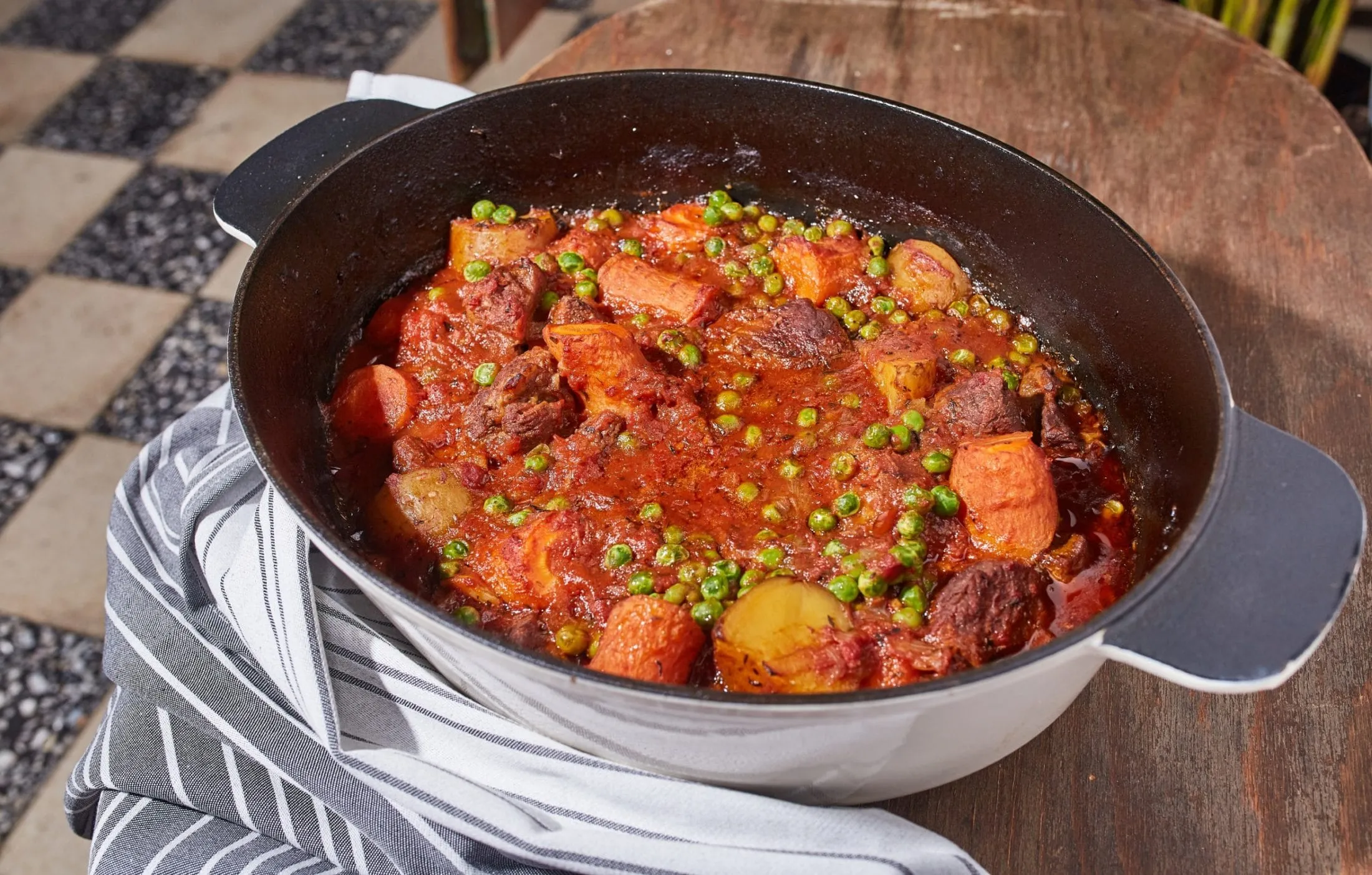 A marharaguhoz a marhalapockát nagyobb darabokra vágjuk, sózzuk, borsozzuk, és egy öntöttvas edényben magas hőmérsékleten körbepirítjuk az olajon, majd kiszedjük. Ezután mehet a visszamaradt szaftra az apróra vágott vöröshagyma, amit sózunk, borsozunk, megszórjuk a fűszerekkel, és üvegesre pároljuk. Rádobjuk a megroppantott fokhagymát, visszarakjuk a húst, és felöntjük a darabolt paradicsommal. 1 órán át fedő alatt főzzük, majd mehet bele az alaplé és a nagy darabokra vágott krumpli, illetve répa. Lefedjük, és 170 fokra előmelegített sütőben 2 órát sütjük, viszont az utolsó 20 perc előtt a borsót is belekeverjük. Friss kenyérrel tálaljuk.