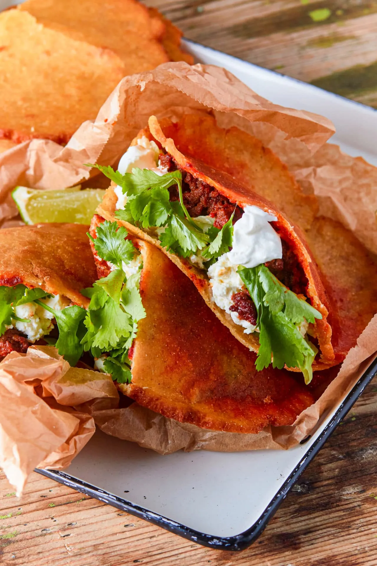 A gorditához az olaj kivételével mindent összedolgozunk, ha túl száraznak találjuk, egy nagyon kevés vizet adhatunk hozzá, ha túl lágynak, akkor a hari masa lisztből rakunk hozzá. Kicsivel nagyobb labdákat formálunk a tésztából, mint egy golflabda, és egy tortillaprés segítségével, vagy akár kézzel, nyújtófával 3-4 mm vastagra nyújtjuk. Bő olajban, közepes lángon aranybarnára sütjük, és amíg még meleg, egy késsel óvatosan szétnyitjuk, mint egy pitát. Megtöltjük a húsos ragunkkal, a felszeletelt jégsalival, sajttal, csorgatunk rá egy kis tejfölt, megszórjuk friss korianderrel, facsarunk rá egy kis lime-ot, és elpusztítjuk.