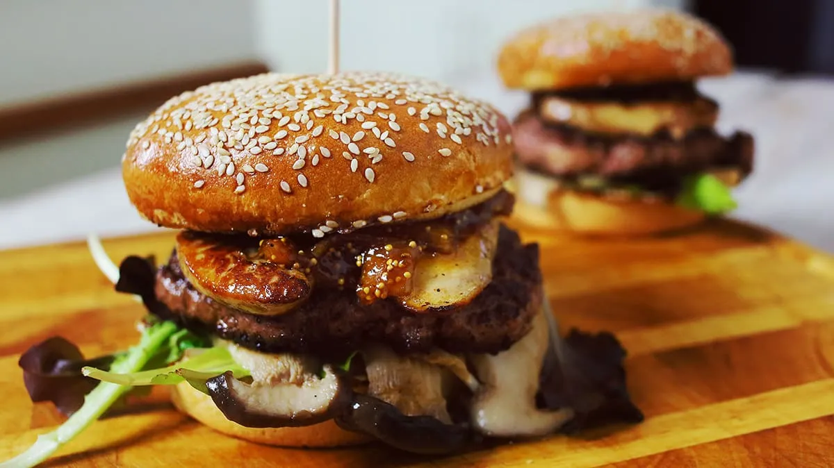 Összeállítjuk a libaburgert: a zsemlére egy kis marék salátalevelet teszünk. Erre néhány szelet savanyított gomba kerül, majd rátesszük a kisült húspogácsát, a tetejére egy szelet sült libamájat, végül pedig a fügeszószt és a zsemle másik felét.
