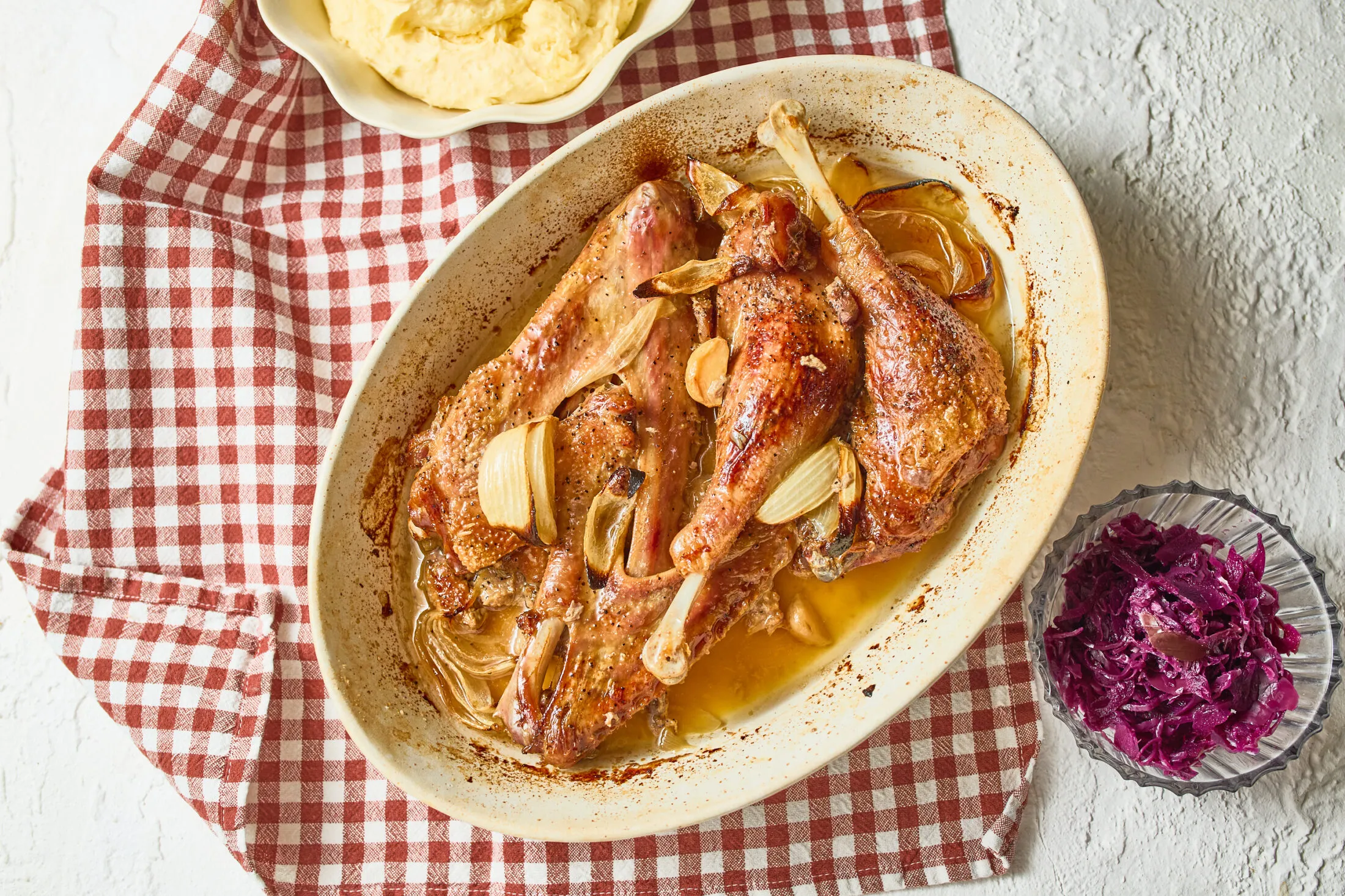 2,5 óra után ellenőrizzük a húst, ha már szinte omlik, akkor jó. Ekkor levesszük róla a fóliát, felemeljük a hőfokot 200 fokra, a kifolyt szafttal meglocsoljuk a libát, és visszatesszük további 20 percre, hogy szép aranybarnára süljön a bőre. Tetszőleges körettel tálaljuk, én krumplipürét és párolt lila káposztát ajánlok mellé.