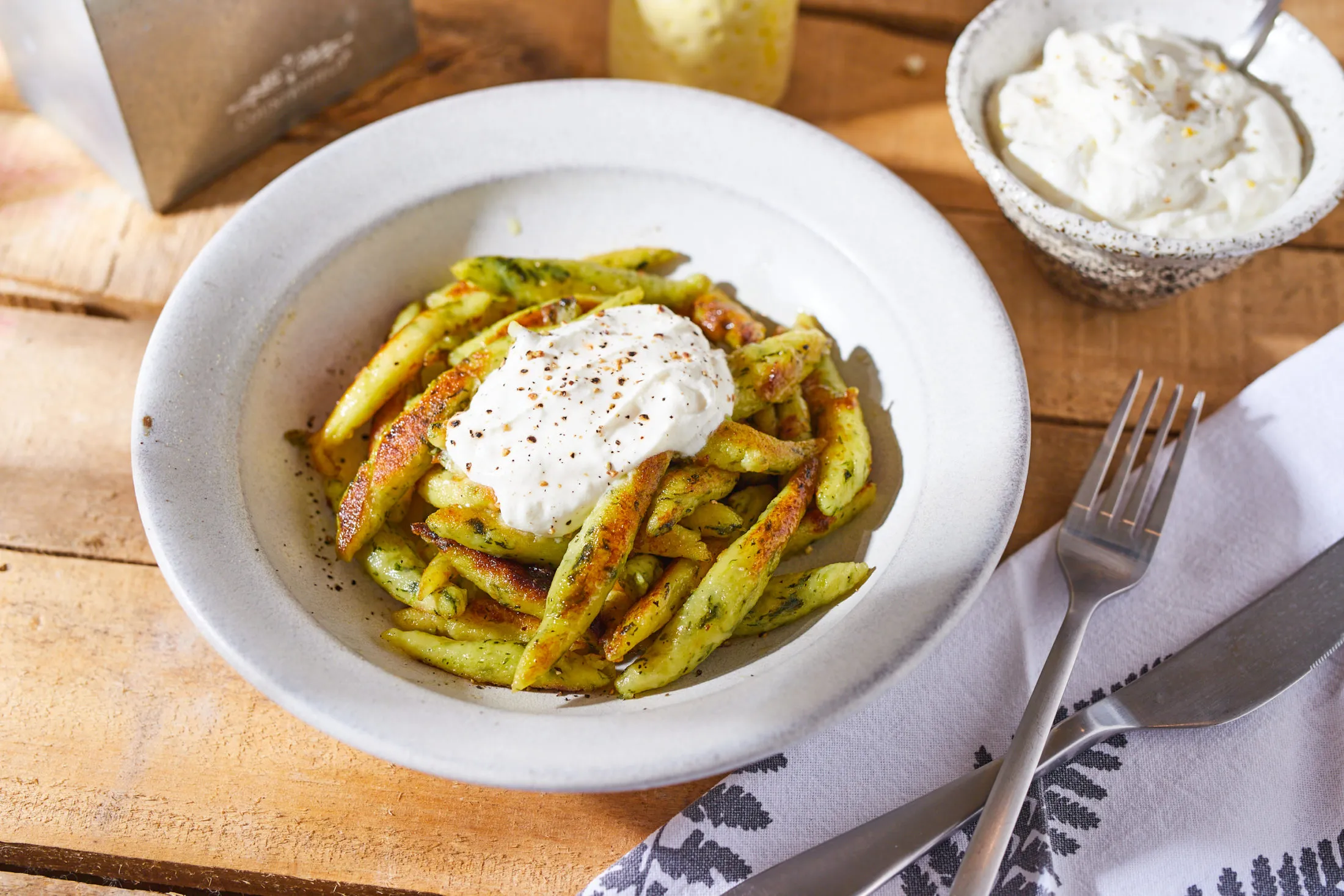 Kis, henger alakú nudlikat formázunk belőle, és gyöngyöző, enyhén sós vízben kifőzzük a nudlikat. Mikor feljöttek a víz felszínére, még pár percig főzzük őket, majd kiszedjük egy tálba. Egy serpenyőben összemelegítjük az olajat és a vajat, majd ebben pirítjuk körbe a nudlikat. Tányérokba szedjük, és 1-1 nagy kanál tejföllel és kevés borssal megszórva tálaljuk.