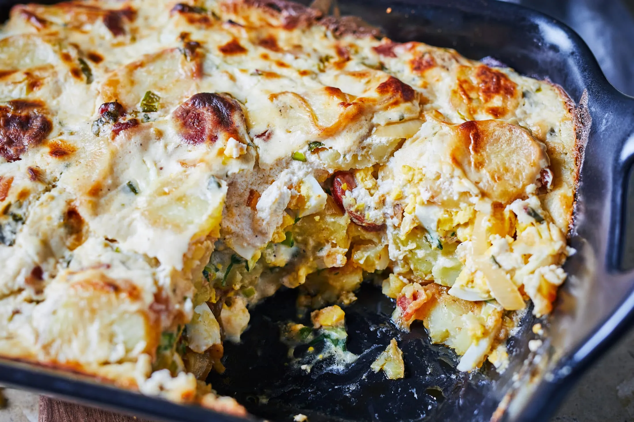 Ezután összepakoljuk az egészet: egy közepes méretű tepsit meglocsolunk egy kevés zsírral. Erre jöhet a krumpli harmada, a pirított kolbászos-baconös hagyma harmada, a tojás fele, egy kevés zsír, majd a besamel harmada. Ezután újabb réteg krumpli, kolbász, a maradék tojás, zsír és besamel jön. Végül a maradék krumpli, zsír, kolbász, és erre jöhet a maradék besamellel elkevert tejföl réteg. 200 fokra előmelegített sütőben addig sütjük, amíg egy kicsit meg nem pirul a teteje (kb. 20-25 perc). Savanyú uborkával tálaljuk.
