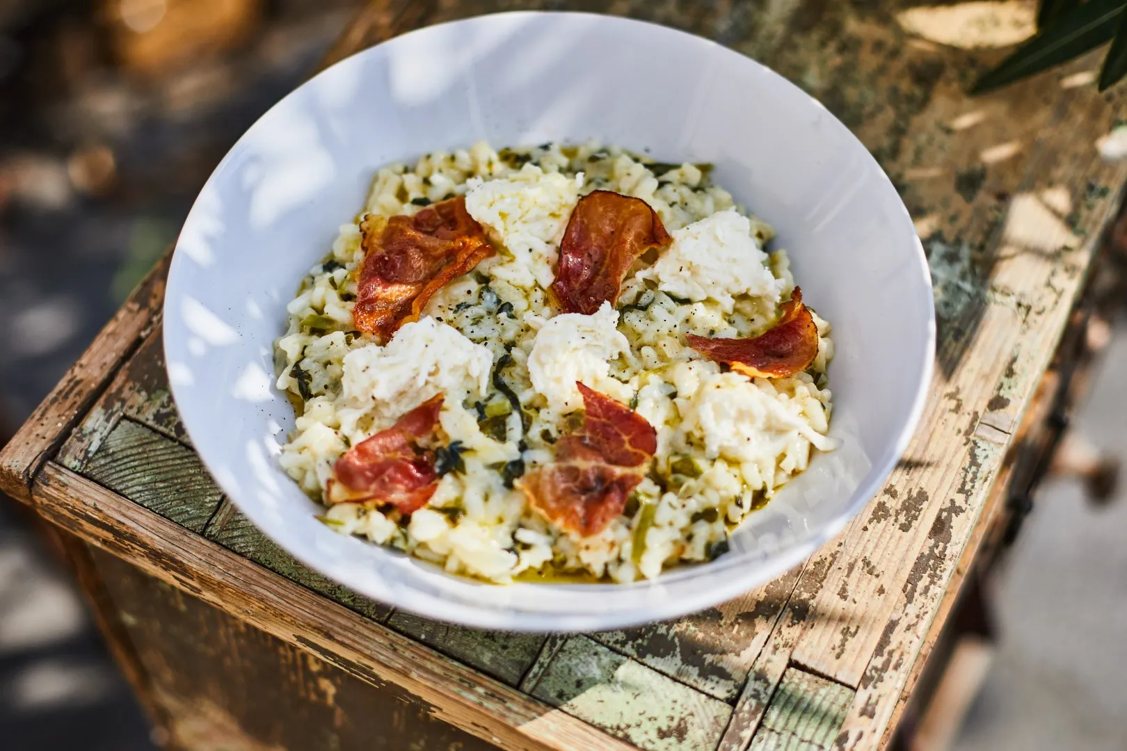 Kb. a felénél belerakjuk az apróra vágott medvehagymát is. A legvégén hozzáadjuk a parmezánt, vajat, sózzuk, borsozzuk és elzárjuk. Kb. 5 percig hagyjuk állni. Közben egy serpenyőben megpirítjuk a sonkát, és a mozzarellát kis darabokra tépkedjük. A rizottót a sült sonkával és a mozzarellával tálaljuk.
