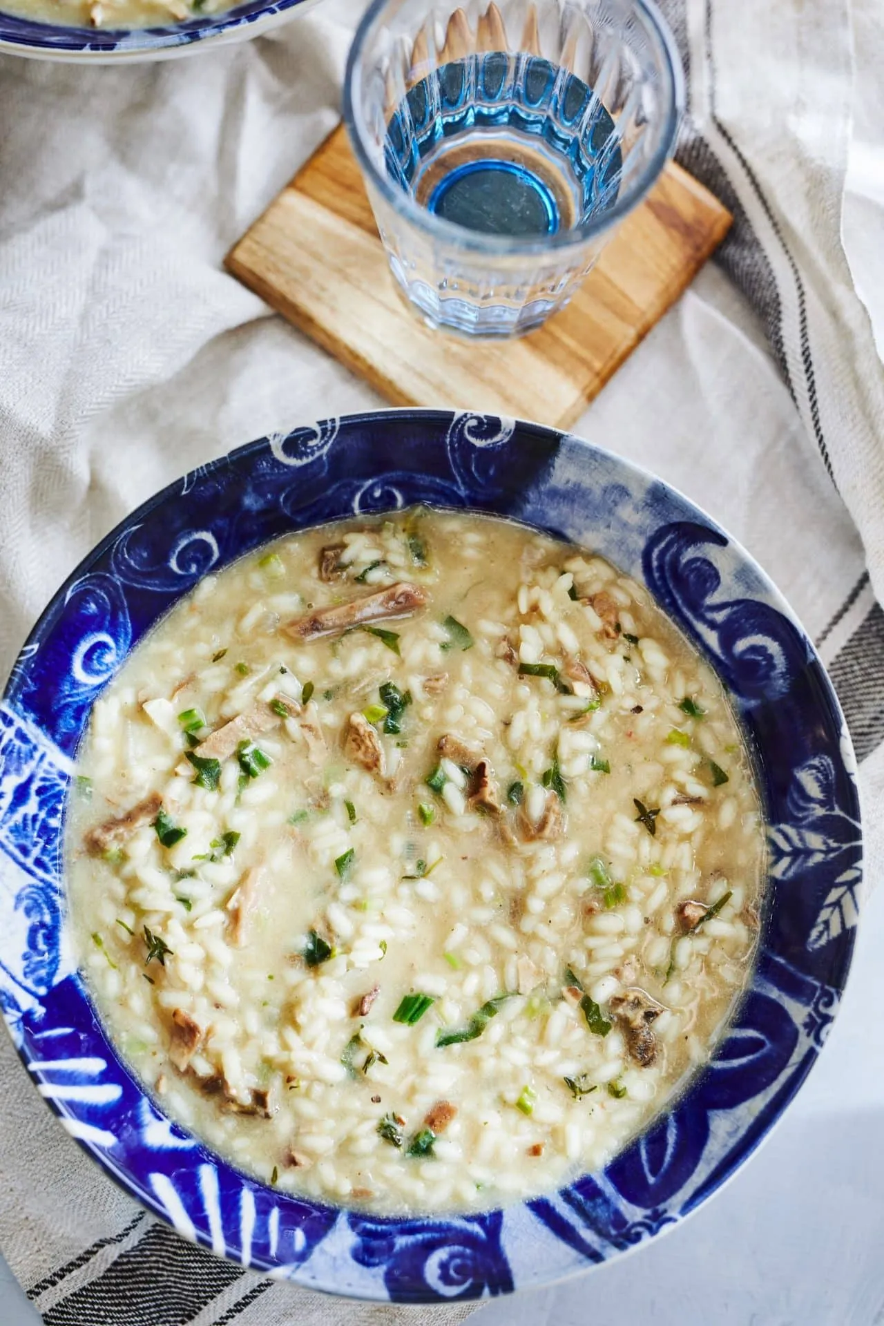 Egy nagy serpenyőben az olajon üvegesre pároljuk az apróra vágott hagymát és fokhagymát, sózzuk, borsozzuk és megszórjuk a kakukkfűvel. Rárakjuk a rizst, elkeverjük, és felöntjük a fehérborral. Ha elpárolgott, hozzáadjuk a gombát, és a szokásos módon, merőkanalanként adagoljuk az alaplevet a rizshez, amíg fel nem szívja az egészet és krémes nem lesz. Az utolsó köröknél belerakjuk az apróra vágott medvehagymát is. Ezután hozzáadjuk a vajat, a parmezánt, pár csepp citromlevet, és tálalás előtt hagyjuk pár percet állni.