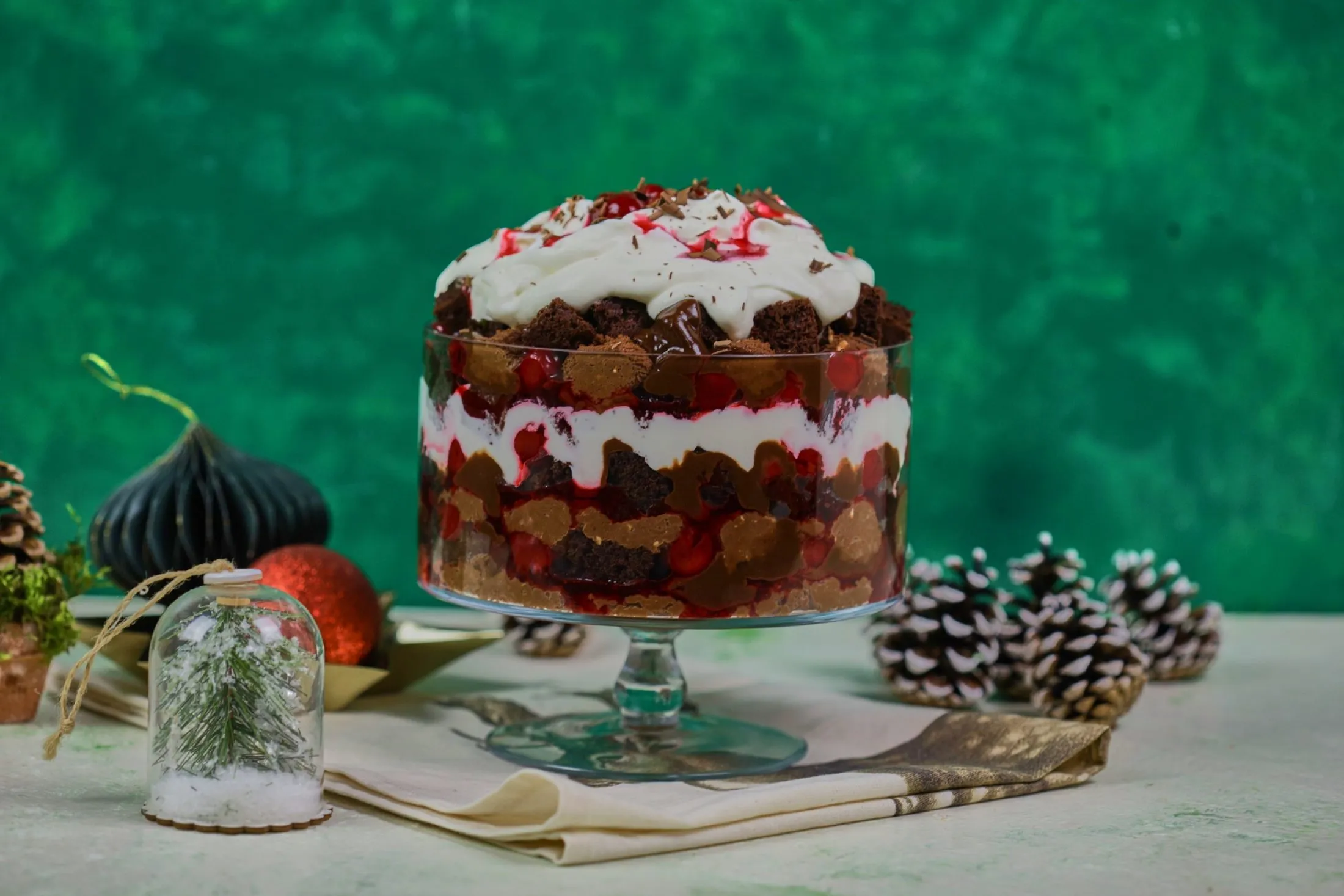 Jöhet a rétegezés: a piskótát apróbb darabokra vágjuk, majd egy nagy tálba rétegezzük a többi hozzávalóval. Legvégül egy nagy adag tejszínhabbal, kicsi meggyraguval és reszelt étcsokival zárjuk a sort.